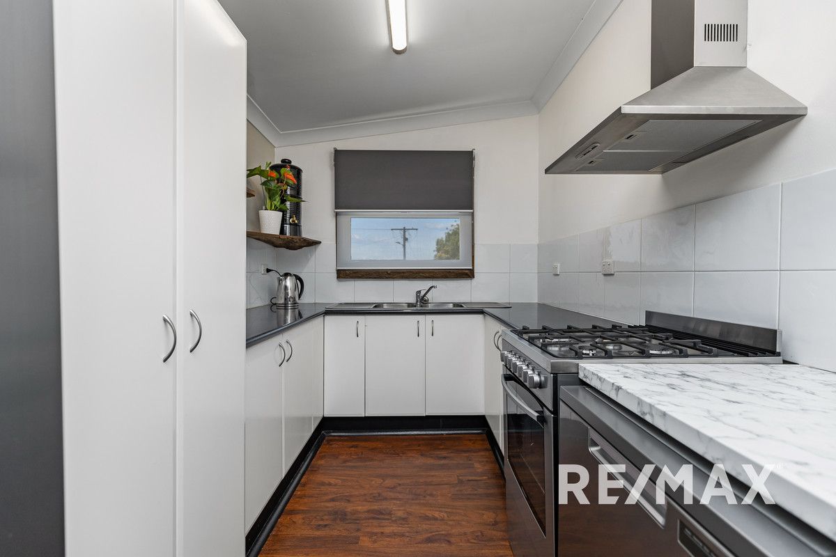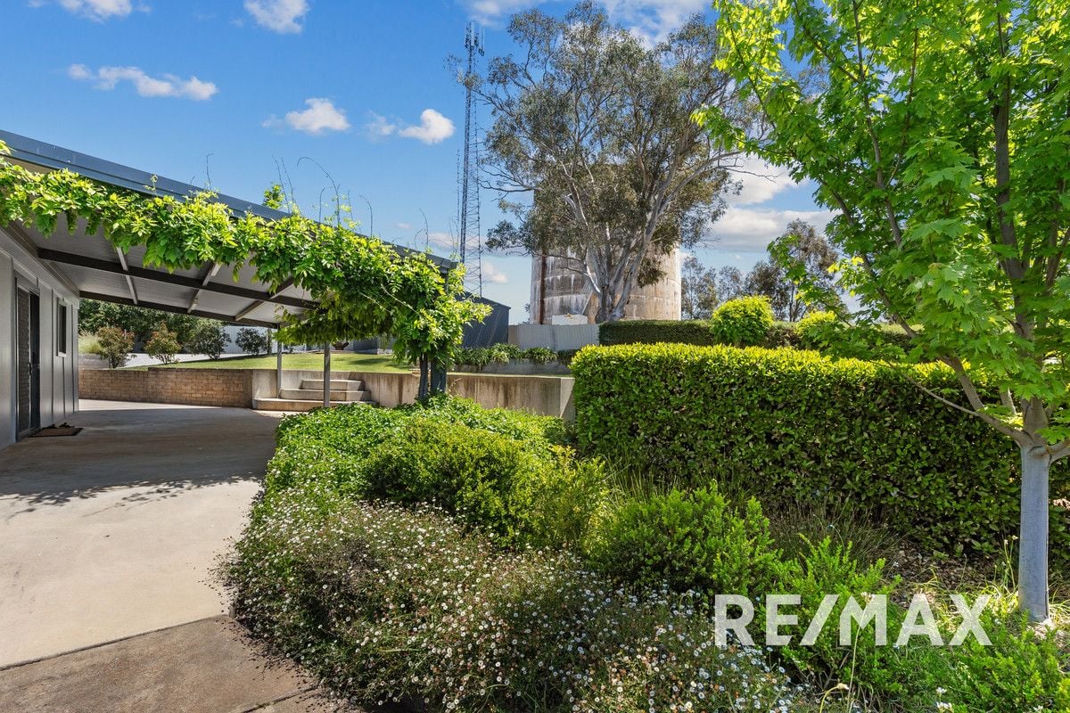 The galley kitchen, offering a double sink with breathtaking views across Junee, is equipped with a modern stove and 4 burner gas cooktop, perfect for crafting culinary delights. Adjacent to the kitchen, a sliding door opens up to a covered outdoor alfresco area, an idyllic spot for dining under the shade of a lush garden, complete with hedging and wisteria.