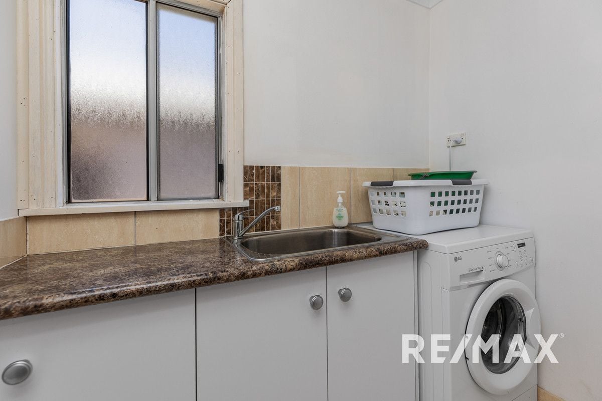 A spacious laundry, complete with laminate benchtops and versatile cabinetry. While a well appointed bathroom that caters to the practical needs of a bustling family life, featuring a separate shower, built in bath and a laminate vanity with storage .