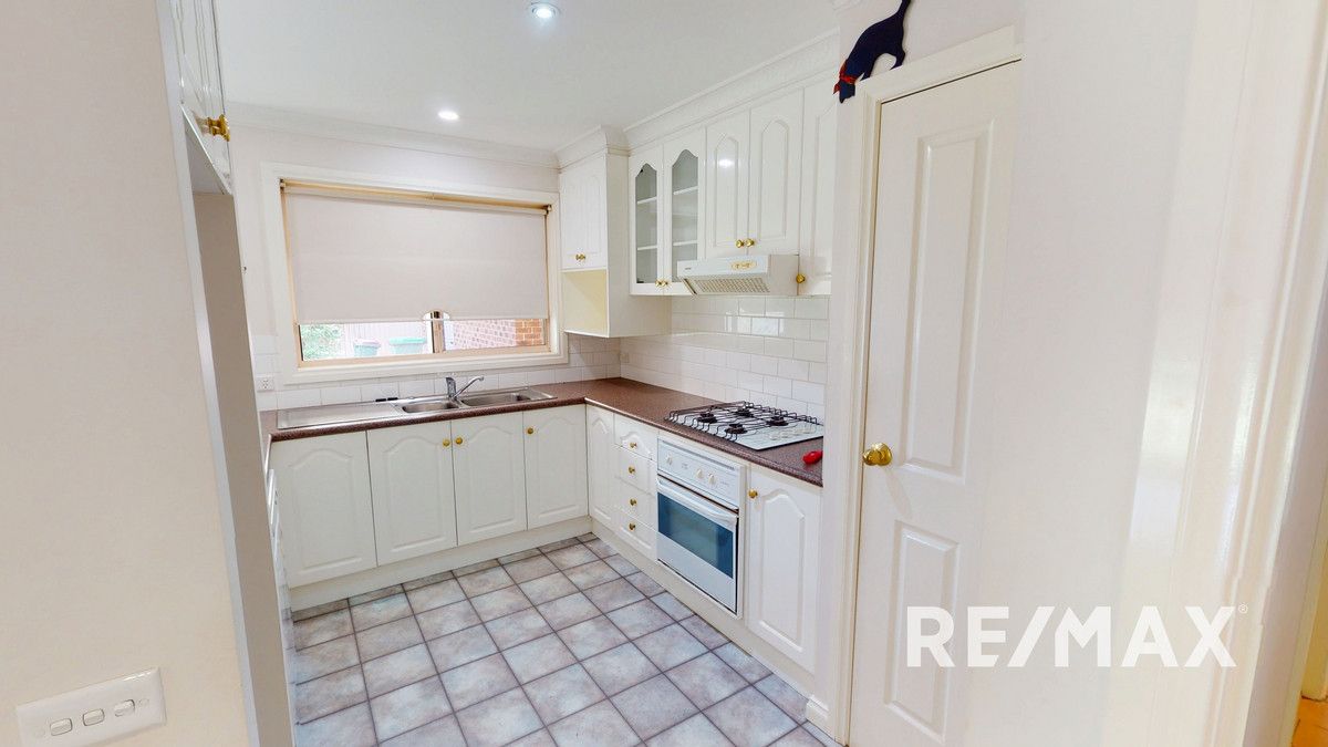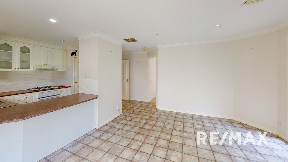 The well-appointed kitchen has plenty of cupboard space, a dishwasher, and a gas cook-top overlooking the patio