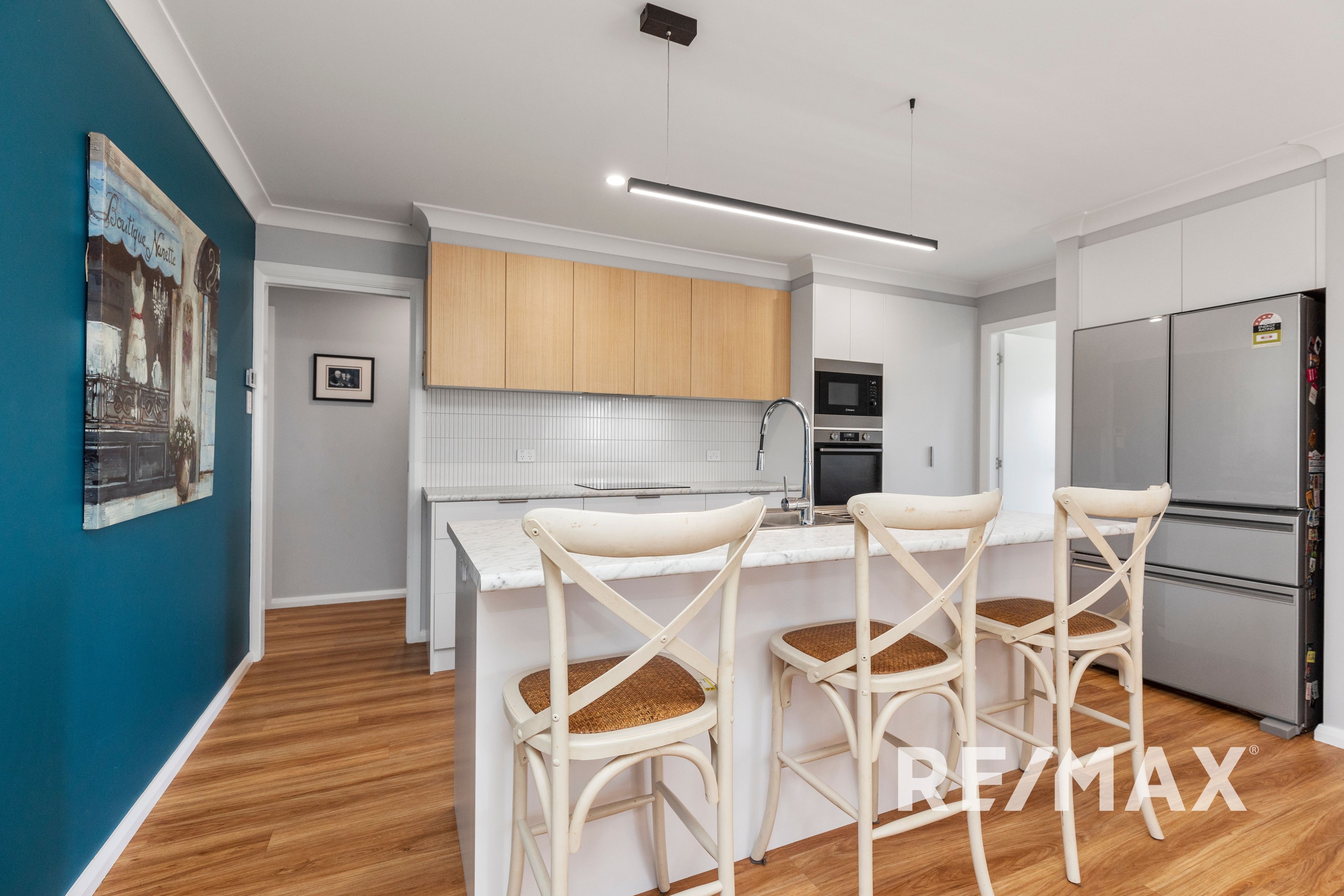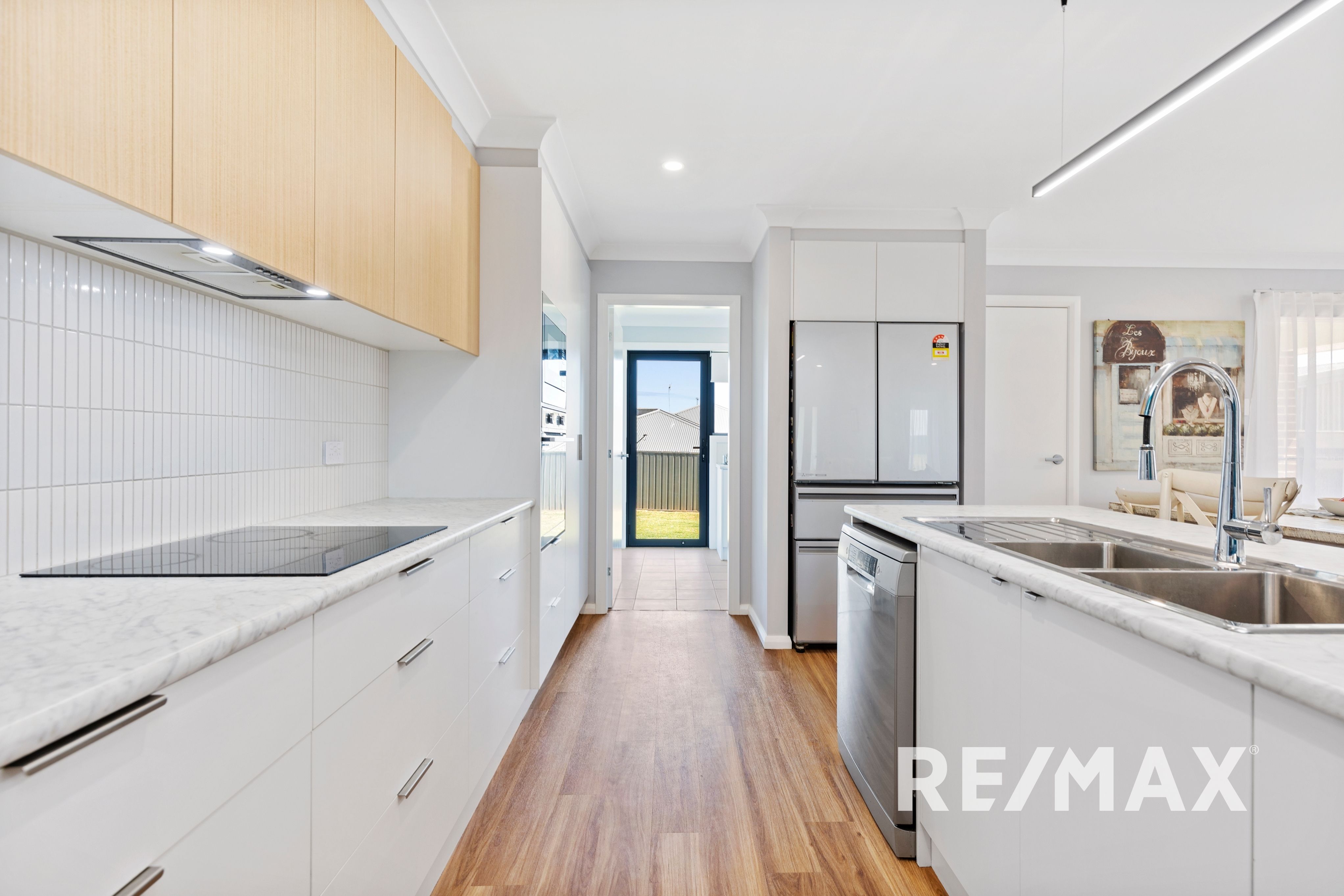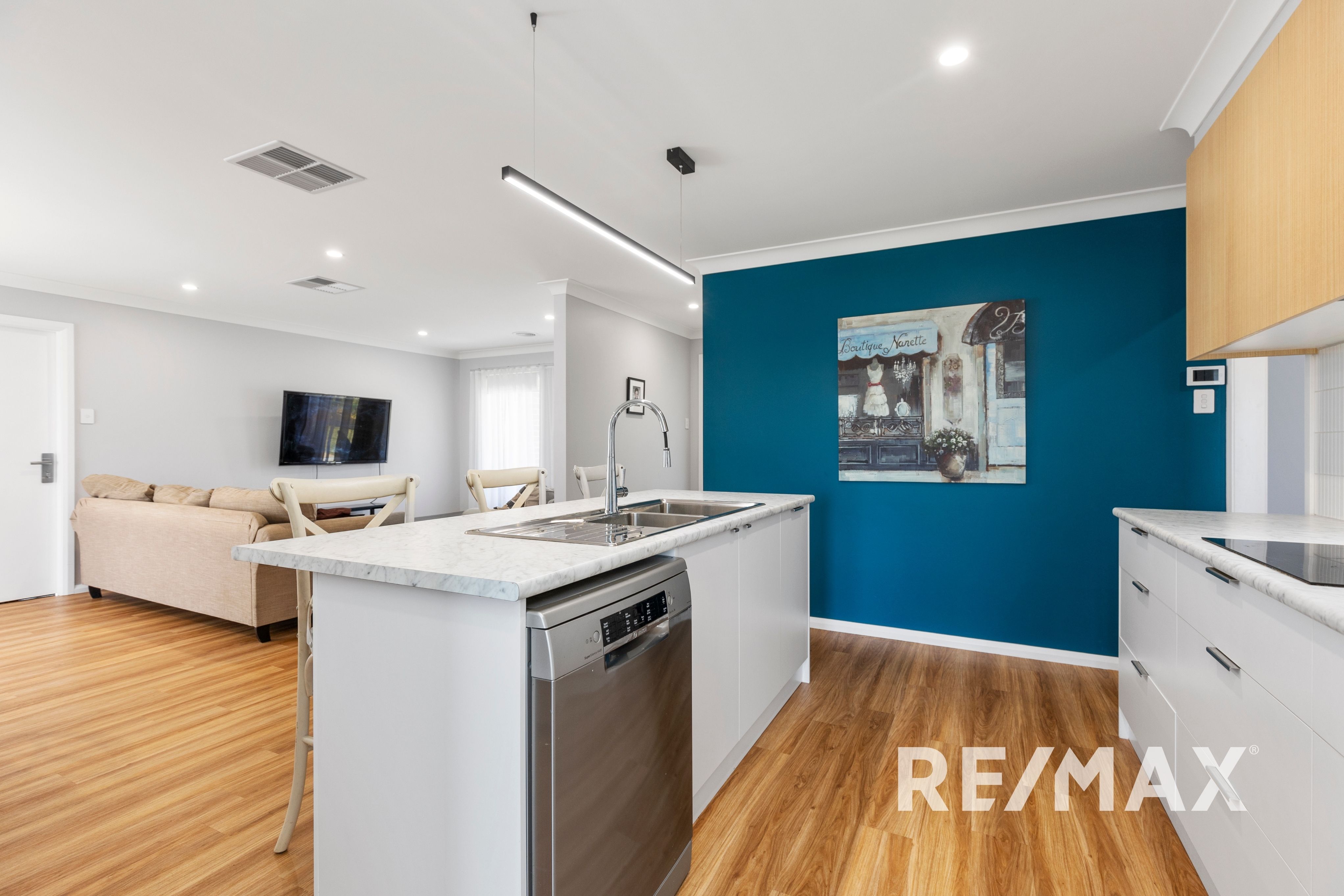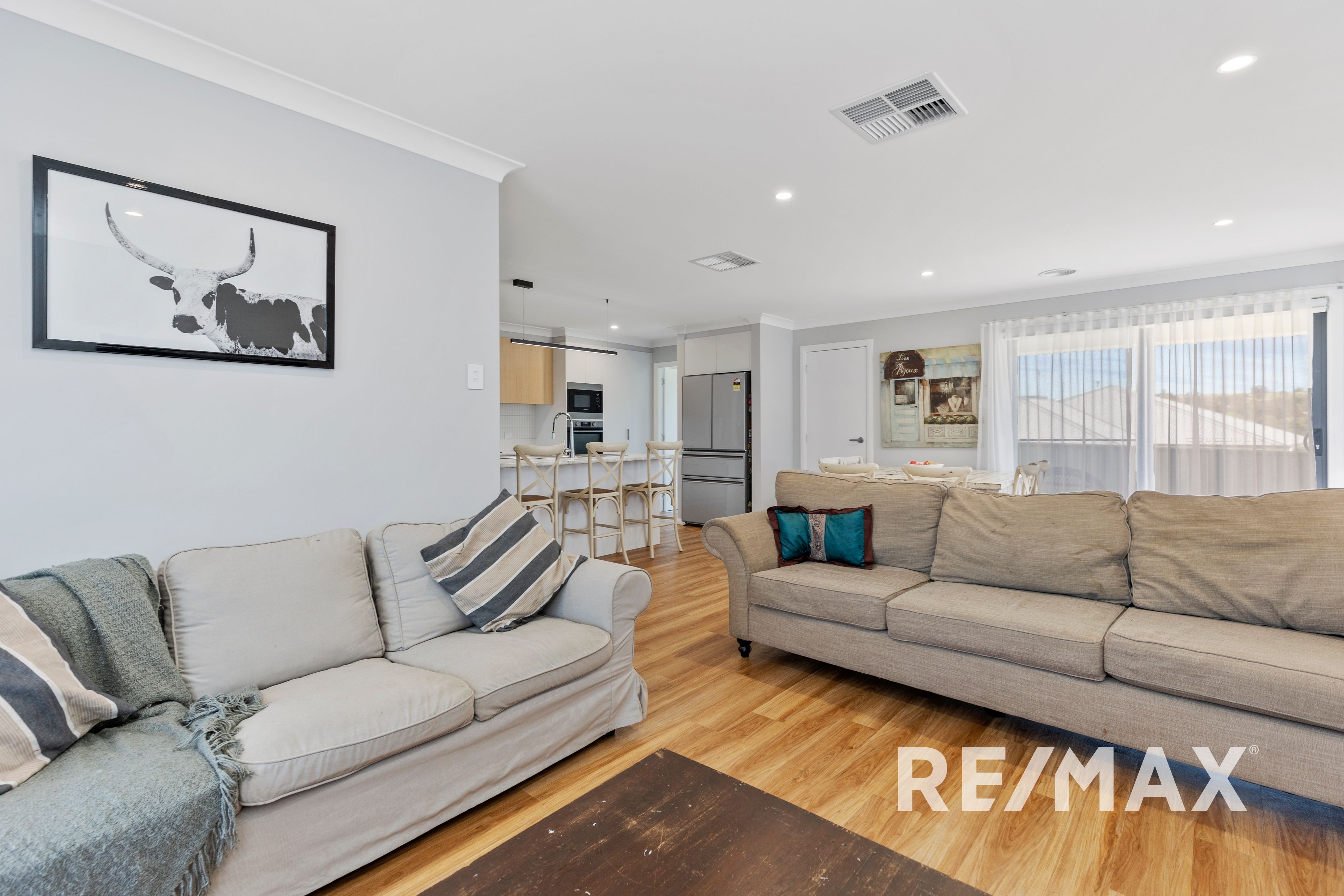 The contemporary kitchen is an entertainer's delight, complete with sleek lighting over the island bench and sink, high-quality appliances including a ceramic cooktop and Bosch dishwasher. The living and dining area seamlessly flow through to the outdoor alfresco area, making it perfect for relaxed gatherings and celebrations.
