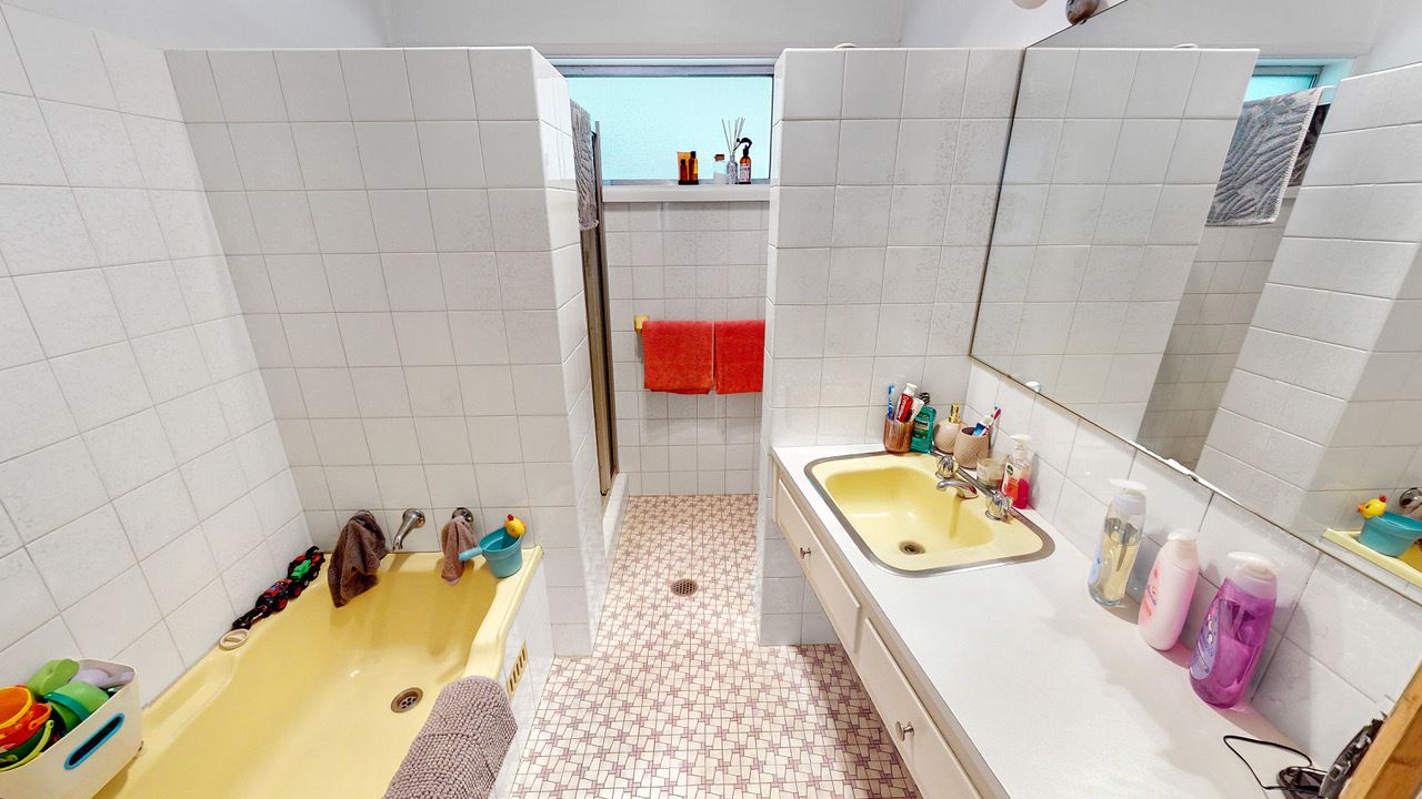 An original bathroom and laundry zone that offers great size and potential plus exterior access.