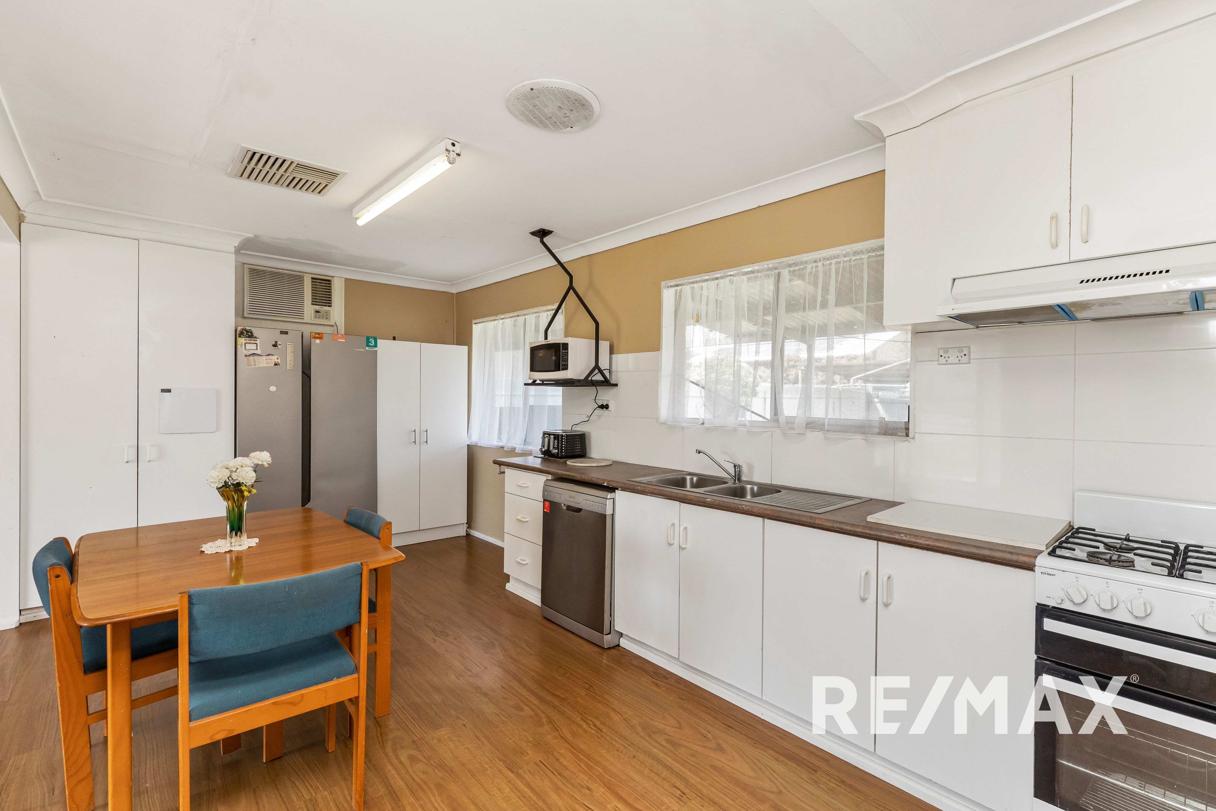 Upon entering the home, you'll find a welcoming open-plan living area, complete with laminate flooring, a modern kitchen fitted with a Bellini dishwasher, Chef gas stove and a Robin Hood range. The living area also boasts a Coolair evaporative cooling system, a Kogan heating and cooling unit, and a freestanding gas heater, ensuring year-round comfort for your family.
