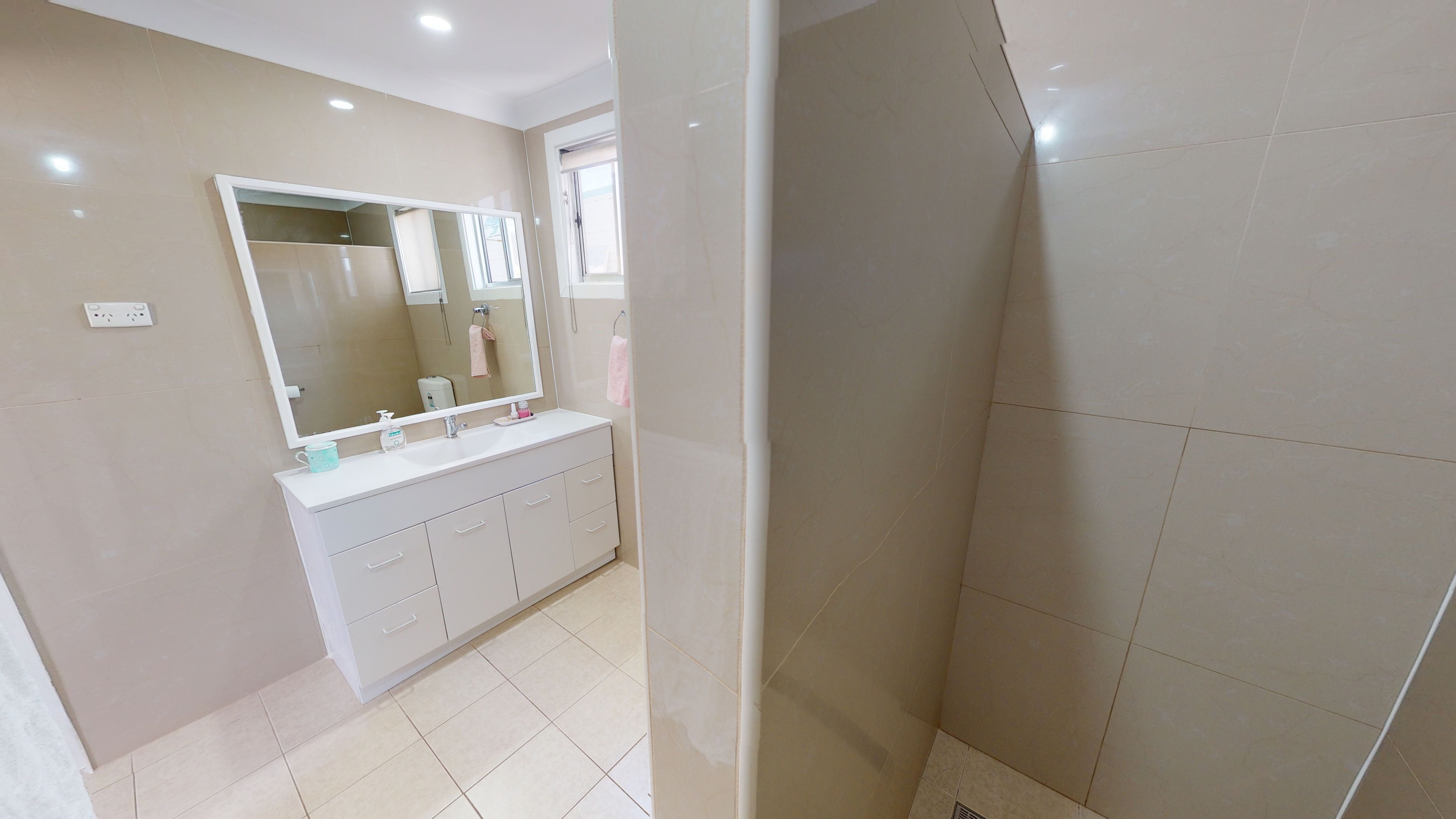 The impressive and stylish bathroom features floor to ceiling tiles, separate shower and a modern vanity.