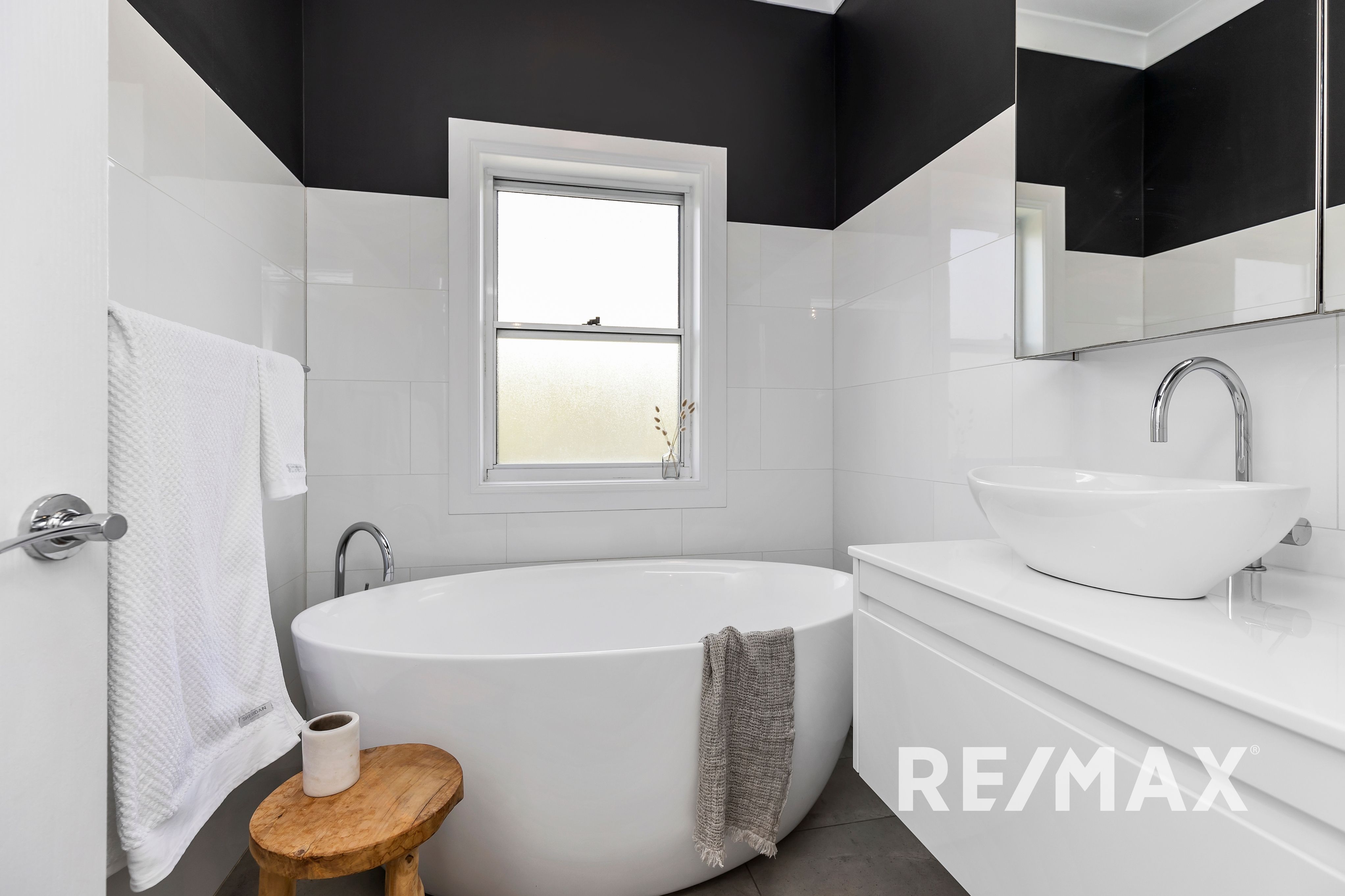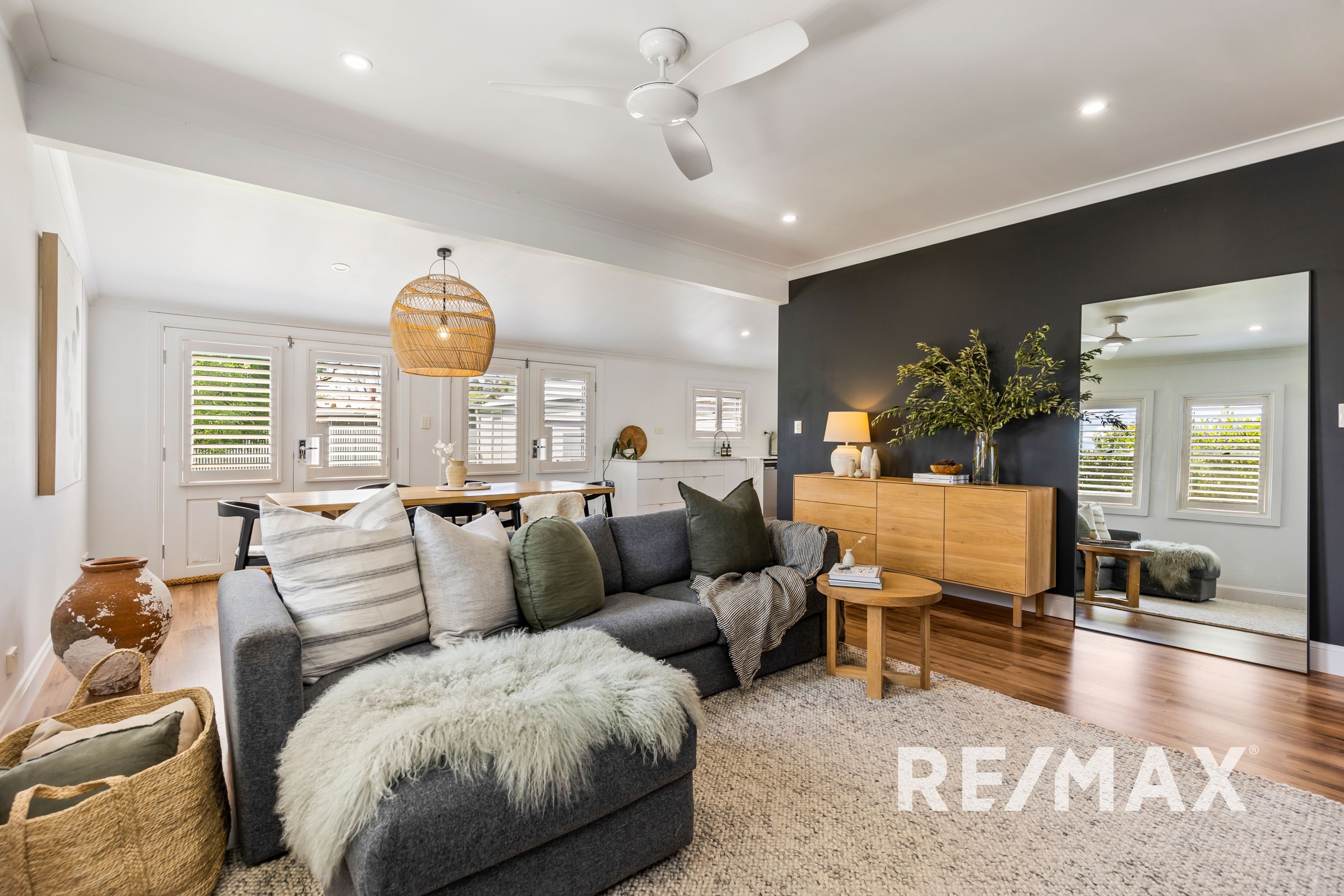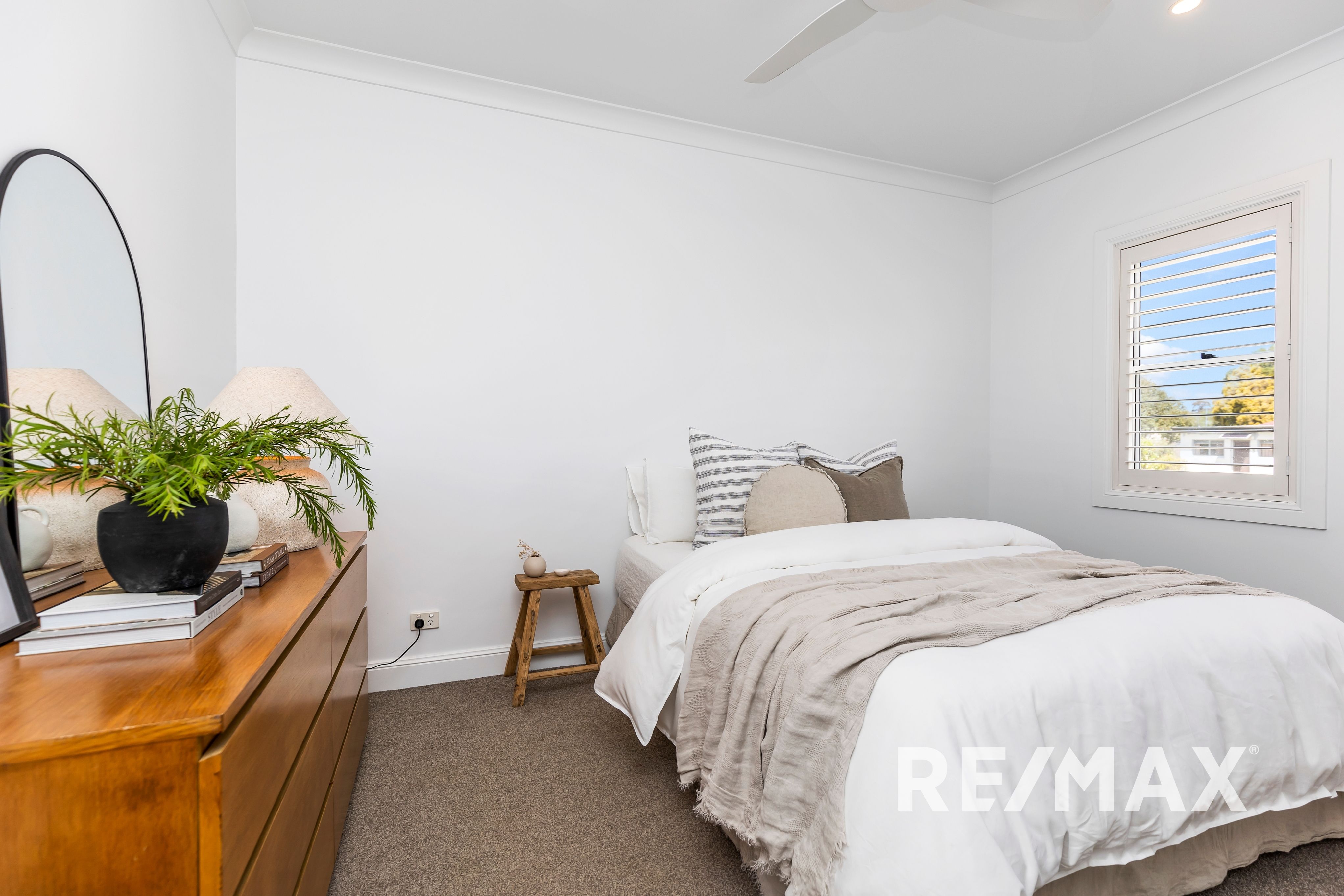 The property boasts shutters on windows throughout, adding a touch of elegance and privacy. The main bathroom is a true haven, complete with a luxurious egg bath, vanity, and mirrored cabinet. The second bathroom, located at the rear of the property, includes a shower. The European laundry, cleverly concealed off the bathroom, is equipped with a tub.