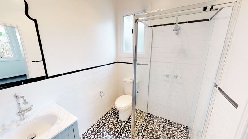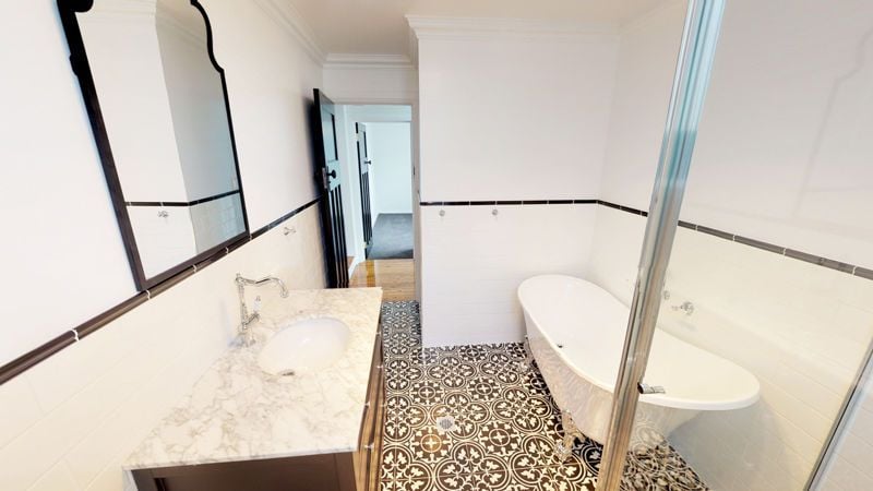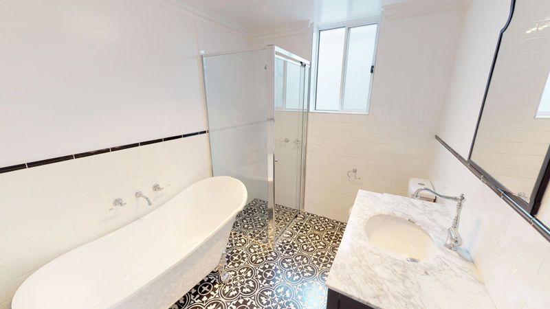 The main bathroom features Encaustic porcelain floor tiles, acrylic claw foot bath, semi frame less shower & federation vanity with marble surface, all which pay homage to the era of the property.