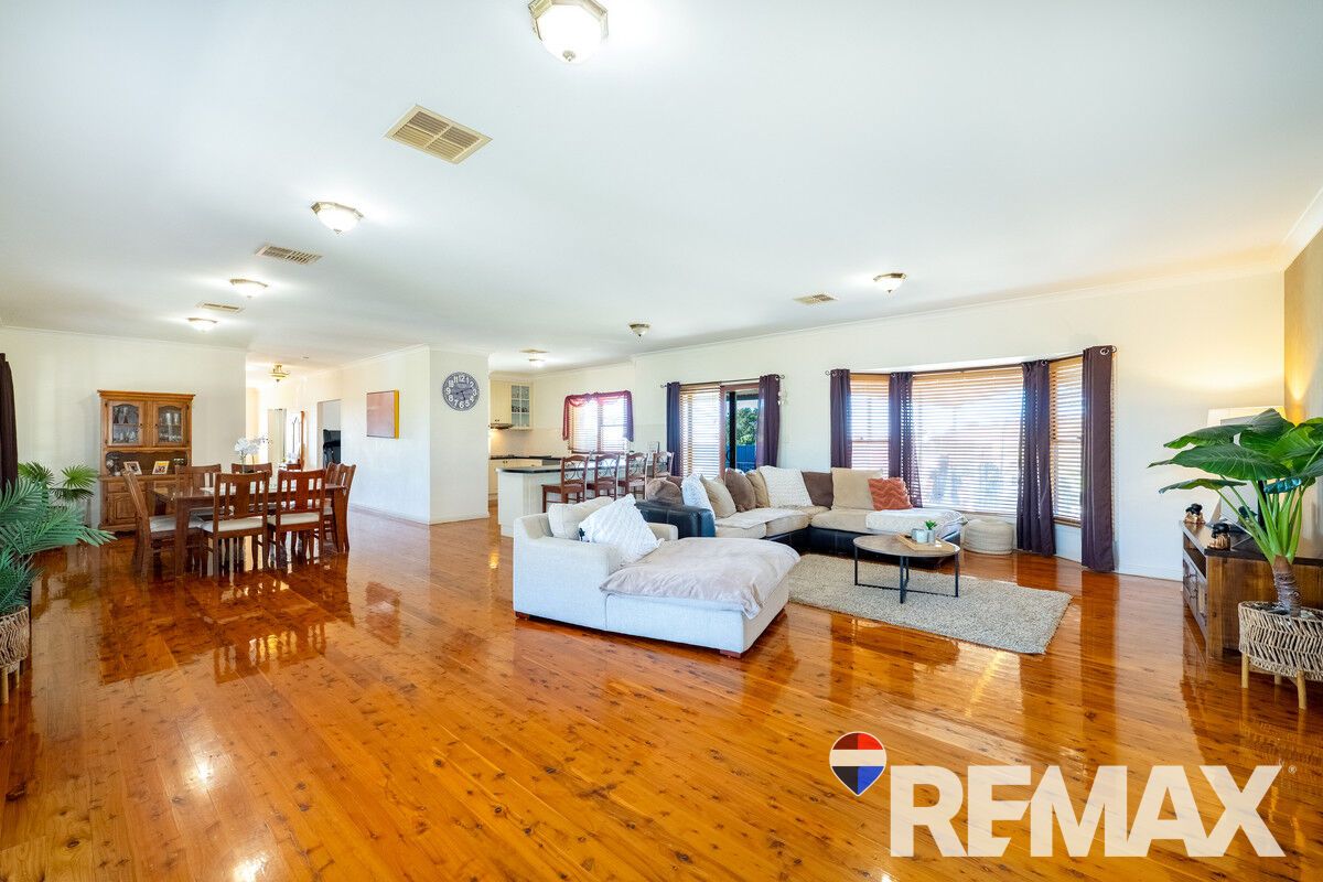 The property boasts an impressive five bedrooms and two bathrooms, with the layout thoughtfully divided into two wings to cater to both privacy and entertainment needs. The master suite is a sanctuary of its own, featuring a spacious walk-in robe and a well-appointed ensuite. Across the hallway, a formal lounge room and a versatile rumpus room present a perfect setting for a family games night or a quiet retreat.
