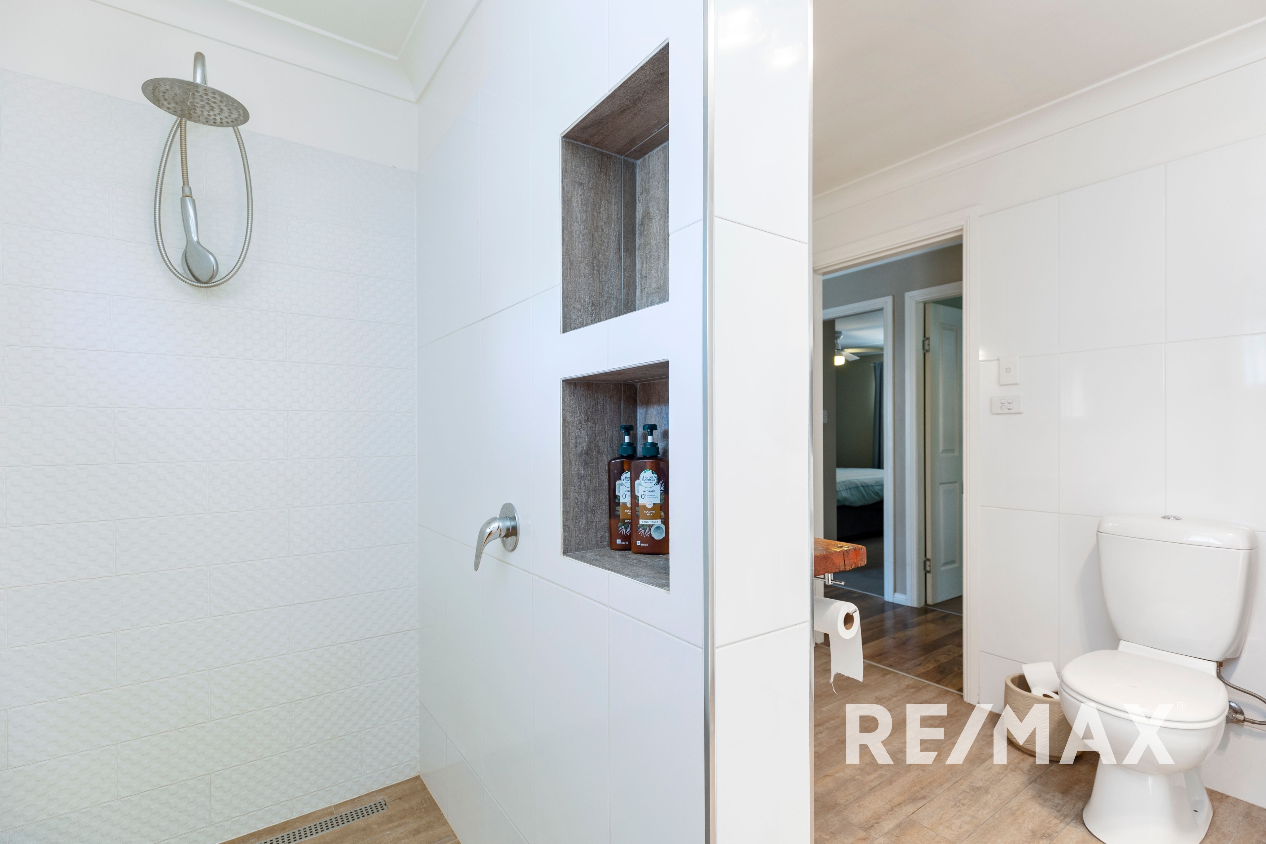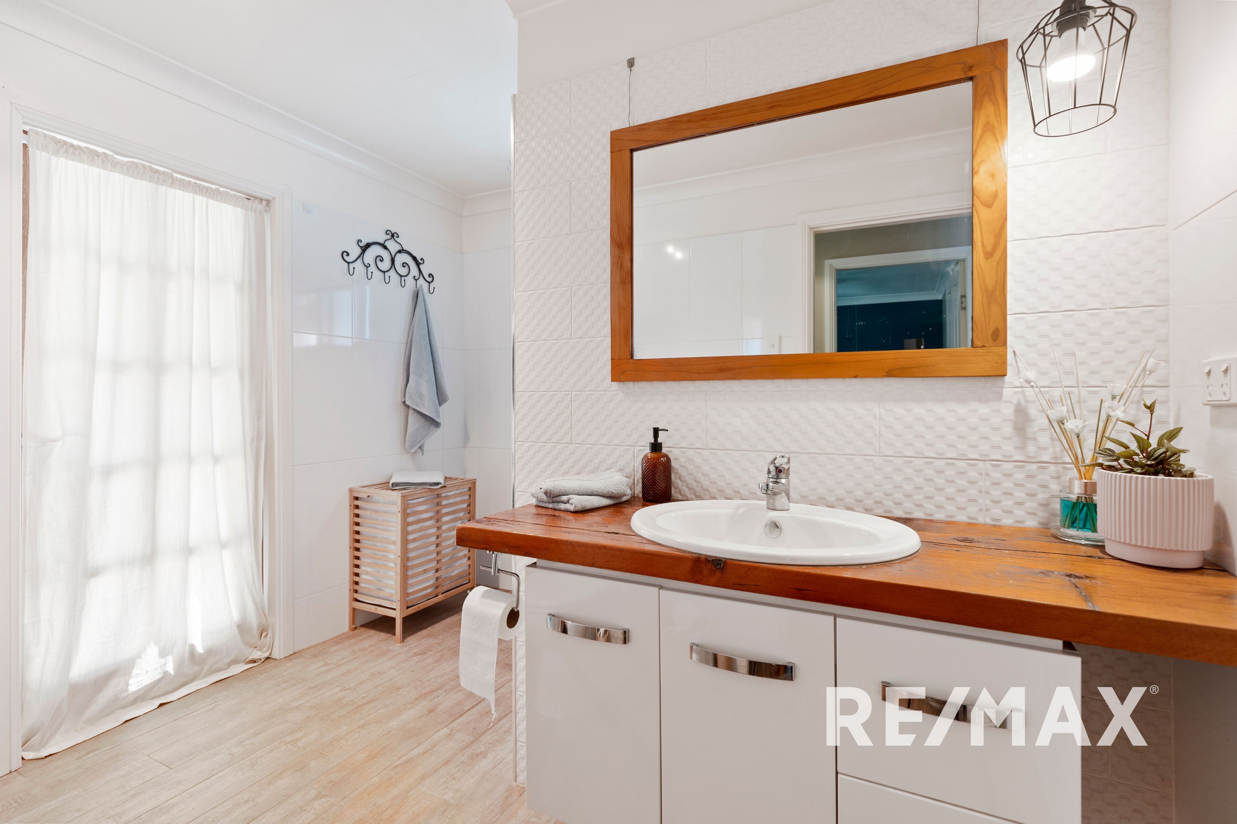 The contemporary bathroom/laundry area boasts timber look tiles, a timber vanity, and a toilet, all with easy access. Outside, the large backyard provides ample space for family activities and easy access to the rear of the property.