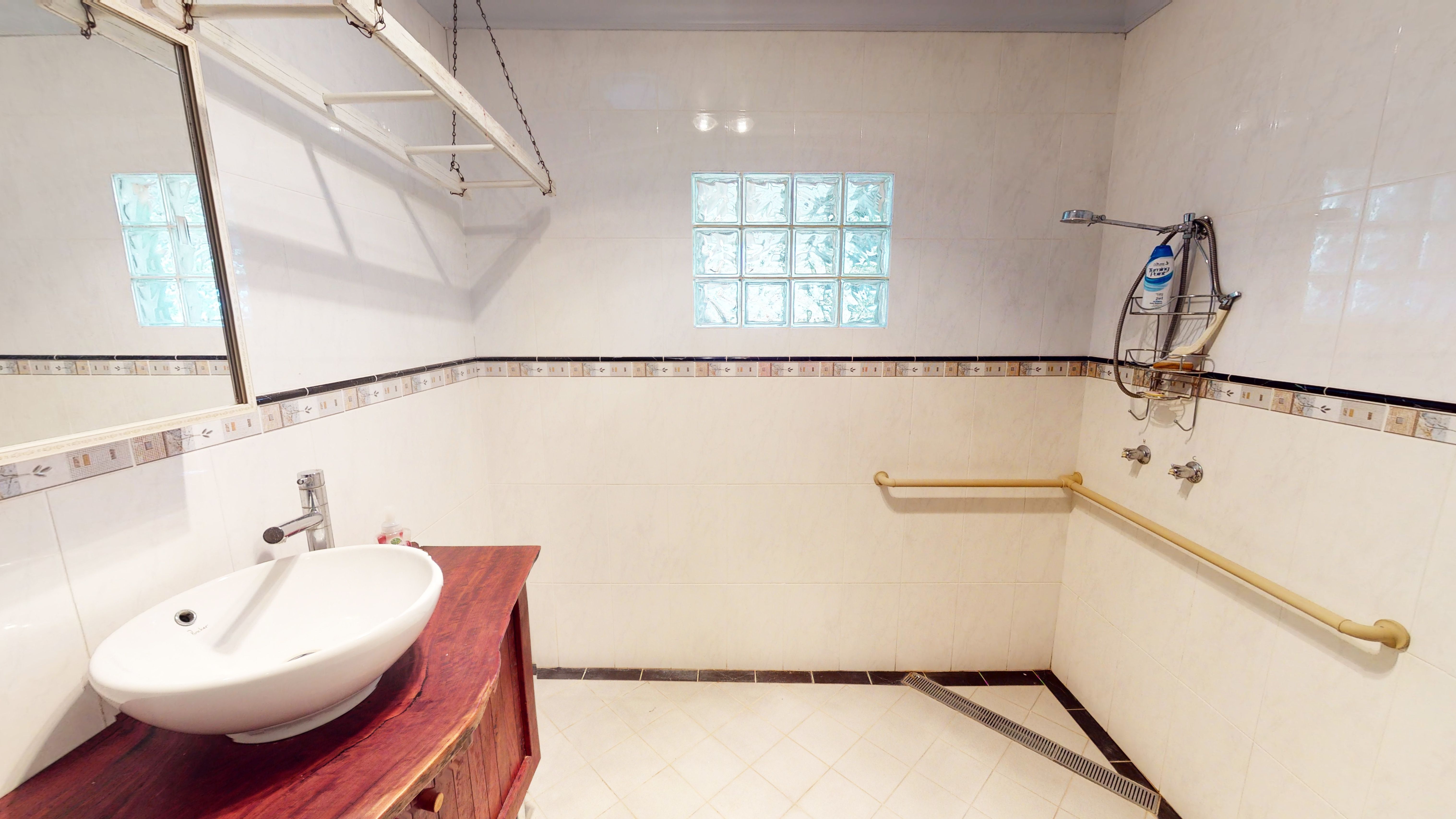 The bathroom was recently renovated with the ease of living in mind with a stunning timber top vanity, floor to ceiling tiles and set up for disabled access