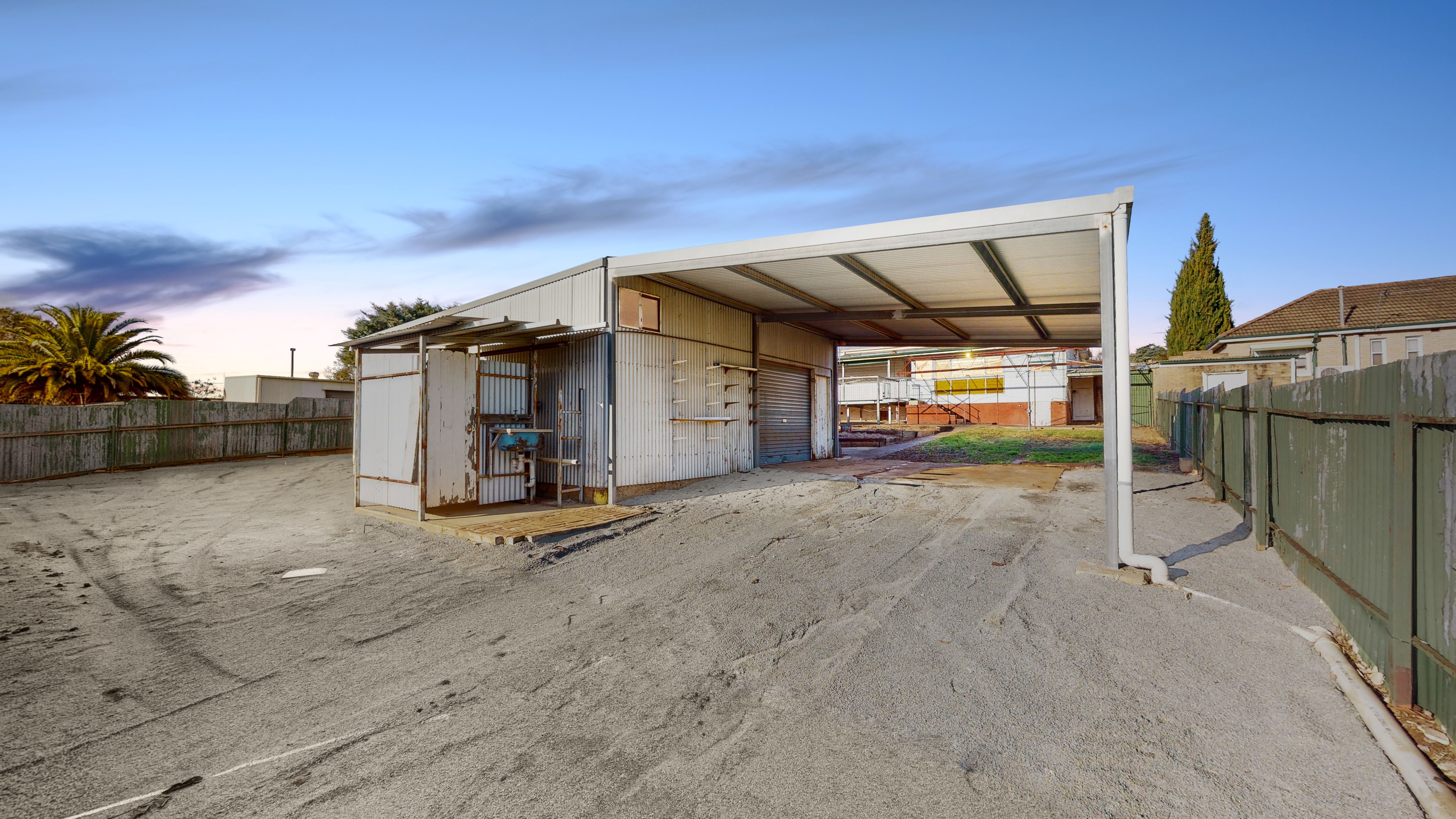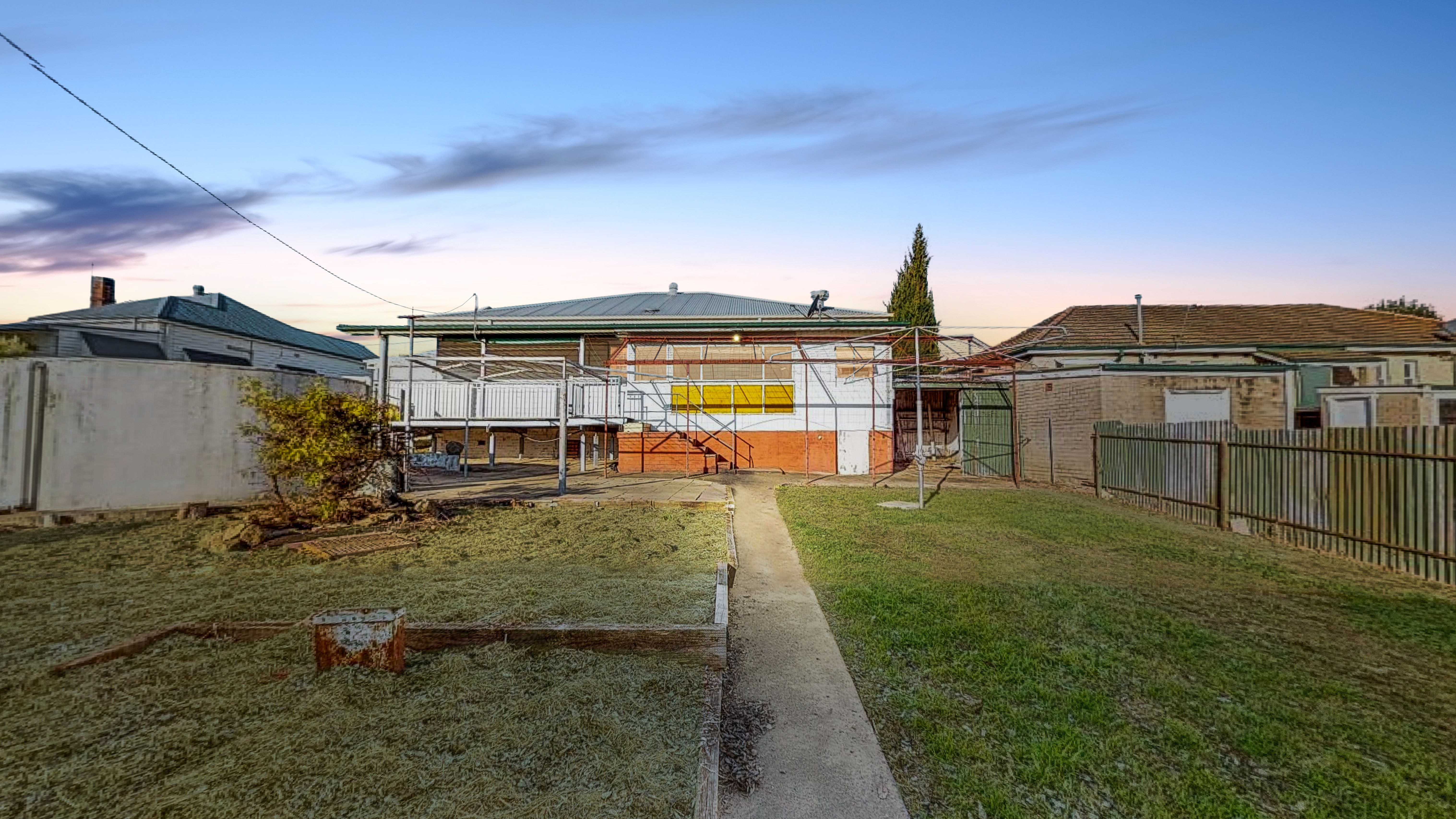 Elevated back deck overlooks a large yard with a massive concrete water tank, rear lane access and a huge powered shed with awning featured of the side.