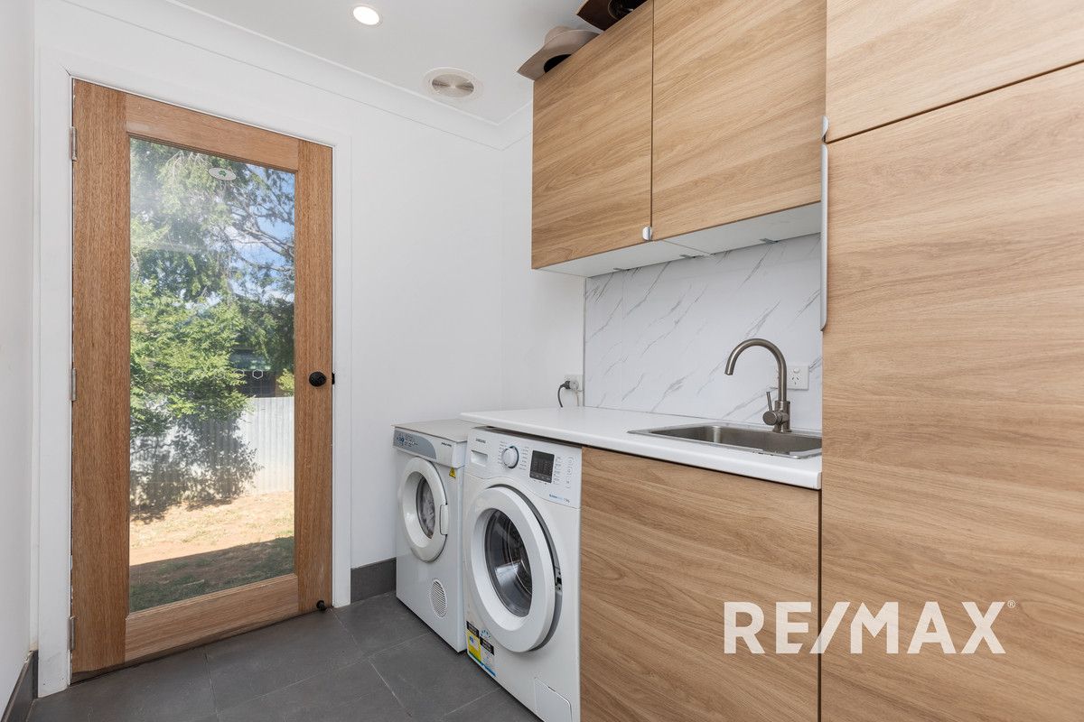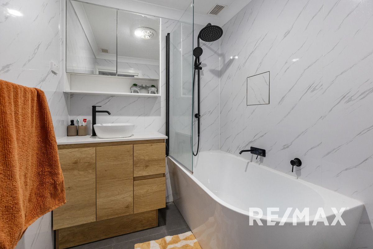 Luxuriate in the floor-to-ceiling tiled bathroom with a timber-look vanity, matt black tapware, and a stylish bath with an overhead shower. The recently revamped laundry room provides ample space for both a washing machine and dryer, set against a backdrop of timber-look cabinetry and a marble-look splashback.
