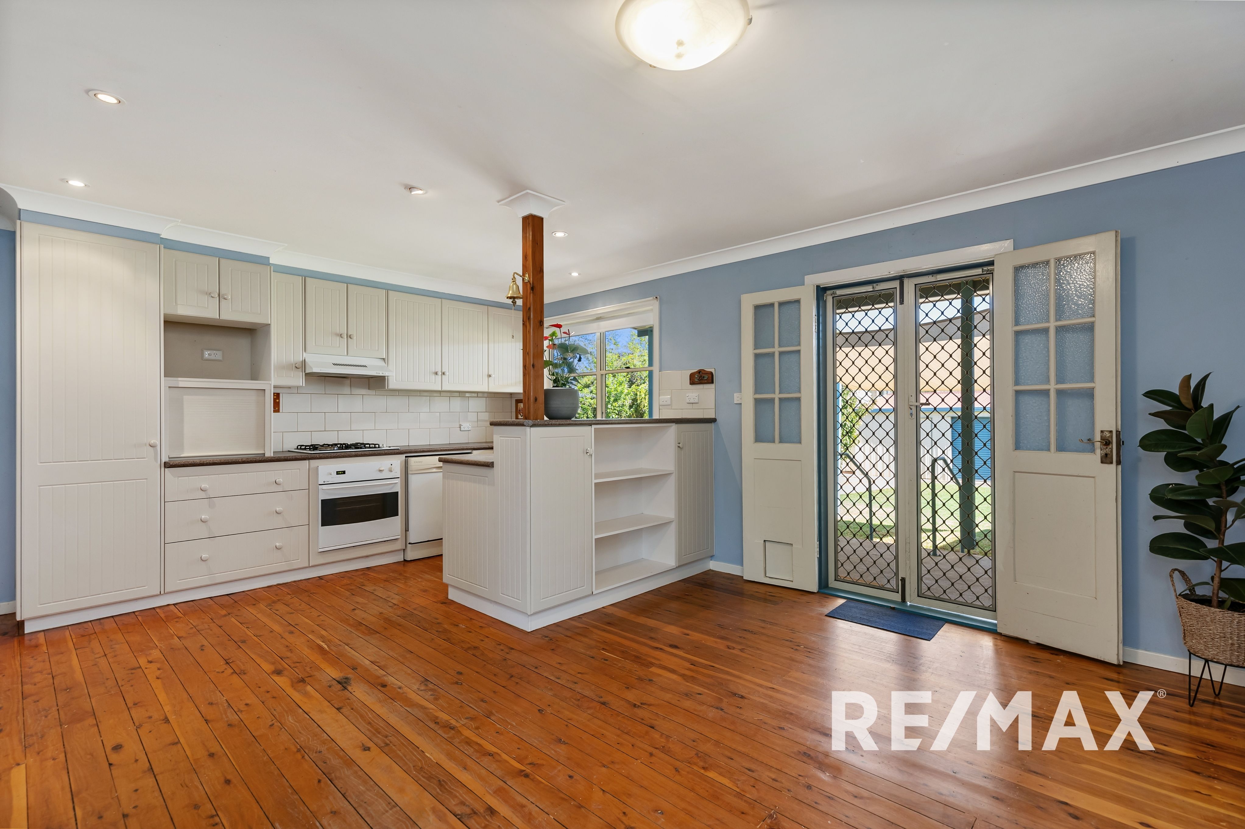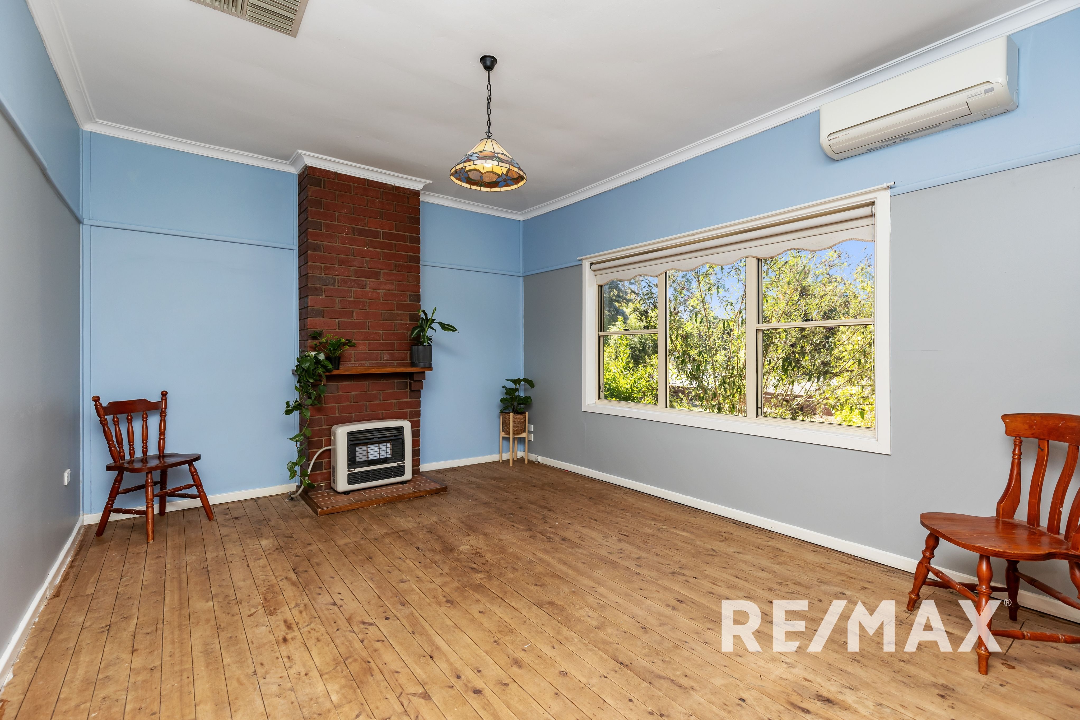 An inviting large lounge room greets you upon entry, adorned with a Mitsubishi split system and a Rinnai gas heater, set beneath an exquisite lead light lamp shade, perfect for those cooler evenings. Murray pine timber floorboards add warmth and character throughout, leading you to the heart of the home - an open-plan kitchen and dining area. The kitchen, equipped with a 4 burner gas cooktop, chef oven, and dishwasher, overlooks the meticulously manicured backyard, creating a picturesque backdrop for family meals.