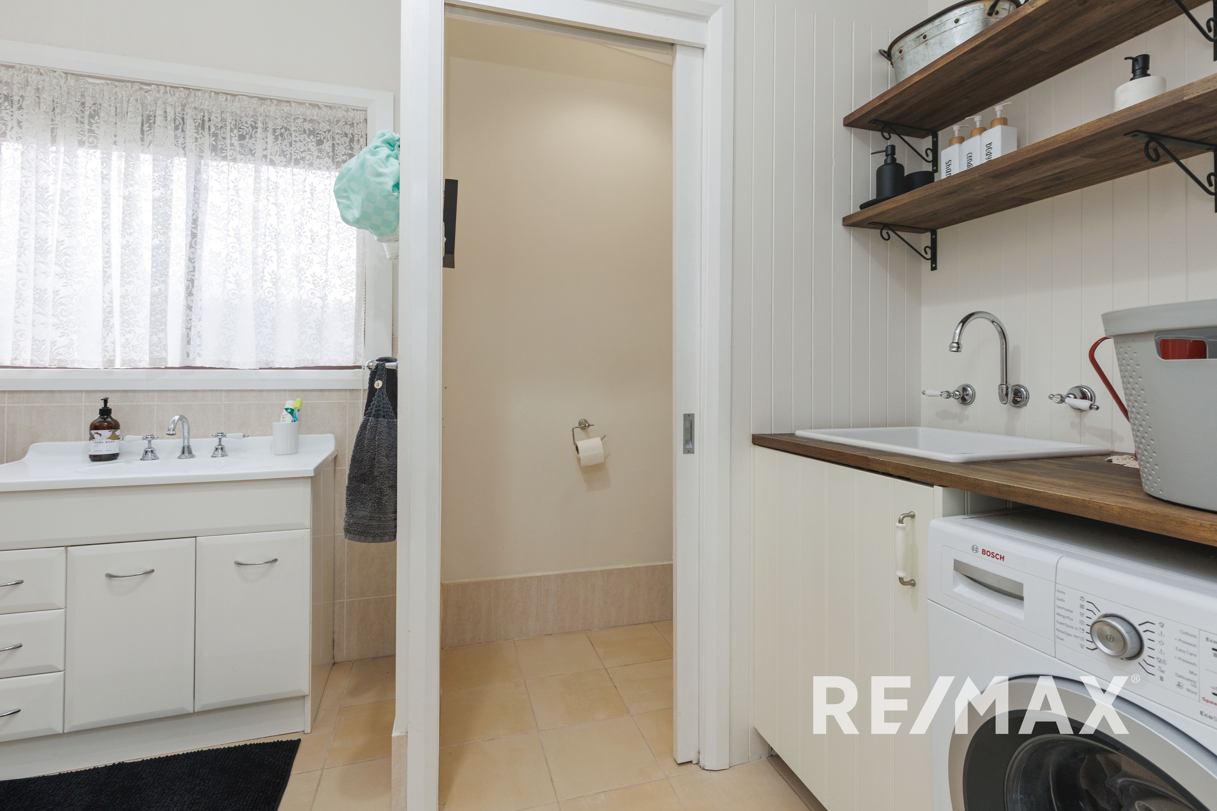 The modern bathroom design incorporates an easy-access shower and a cleverly integrated laundry nook. Step outside to discover the elevated timber deck, an idyllic setting for summer entertaining, which cascades down to a paved dining area - perfect for leisurely relaxation or enjoying the warmth of an outdoor fire pit.