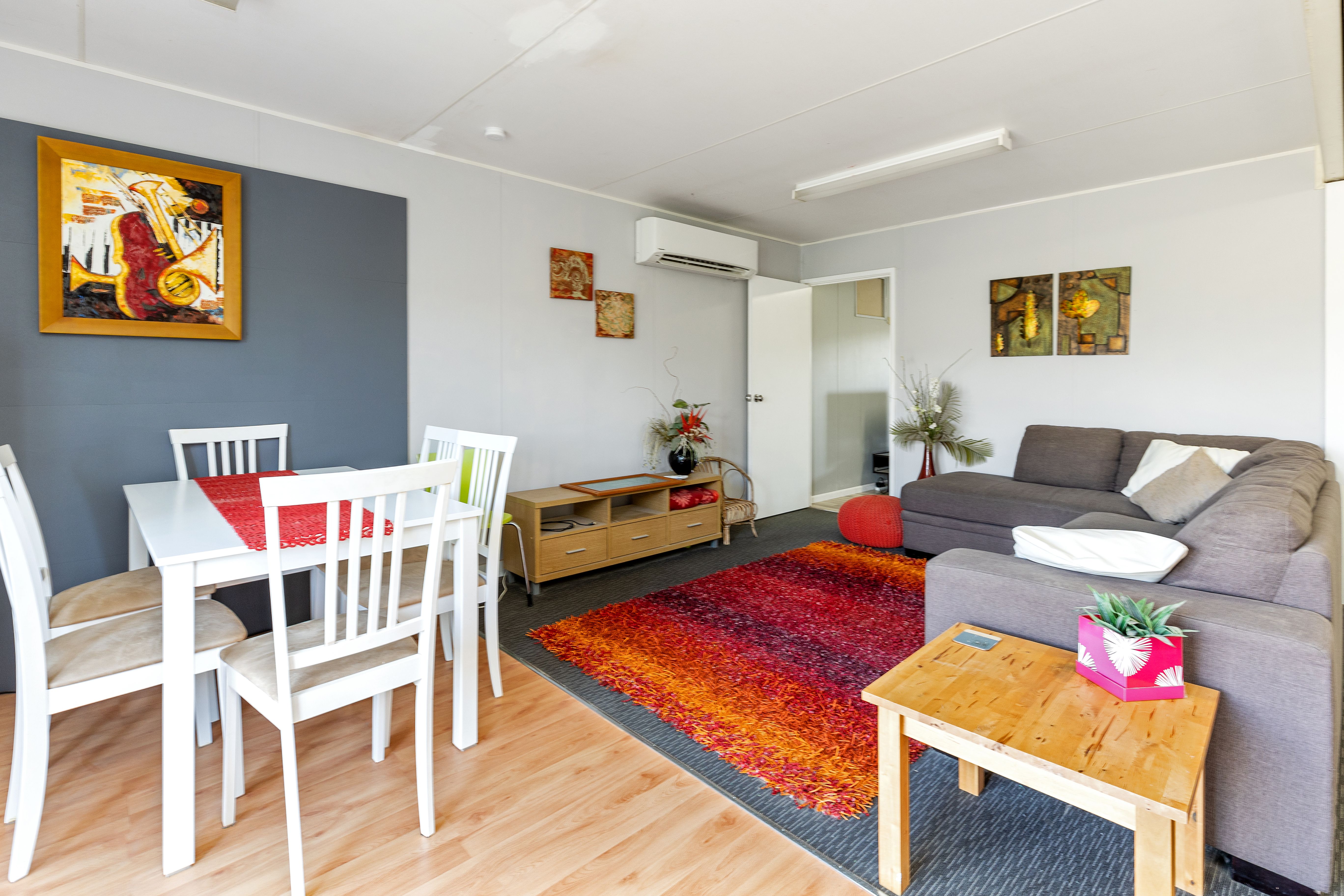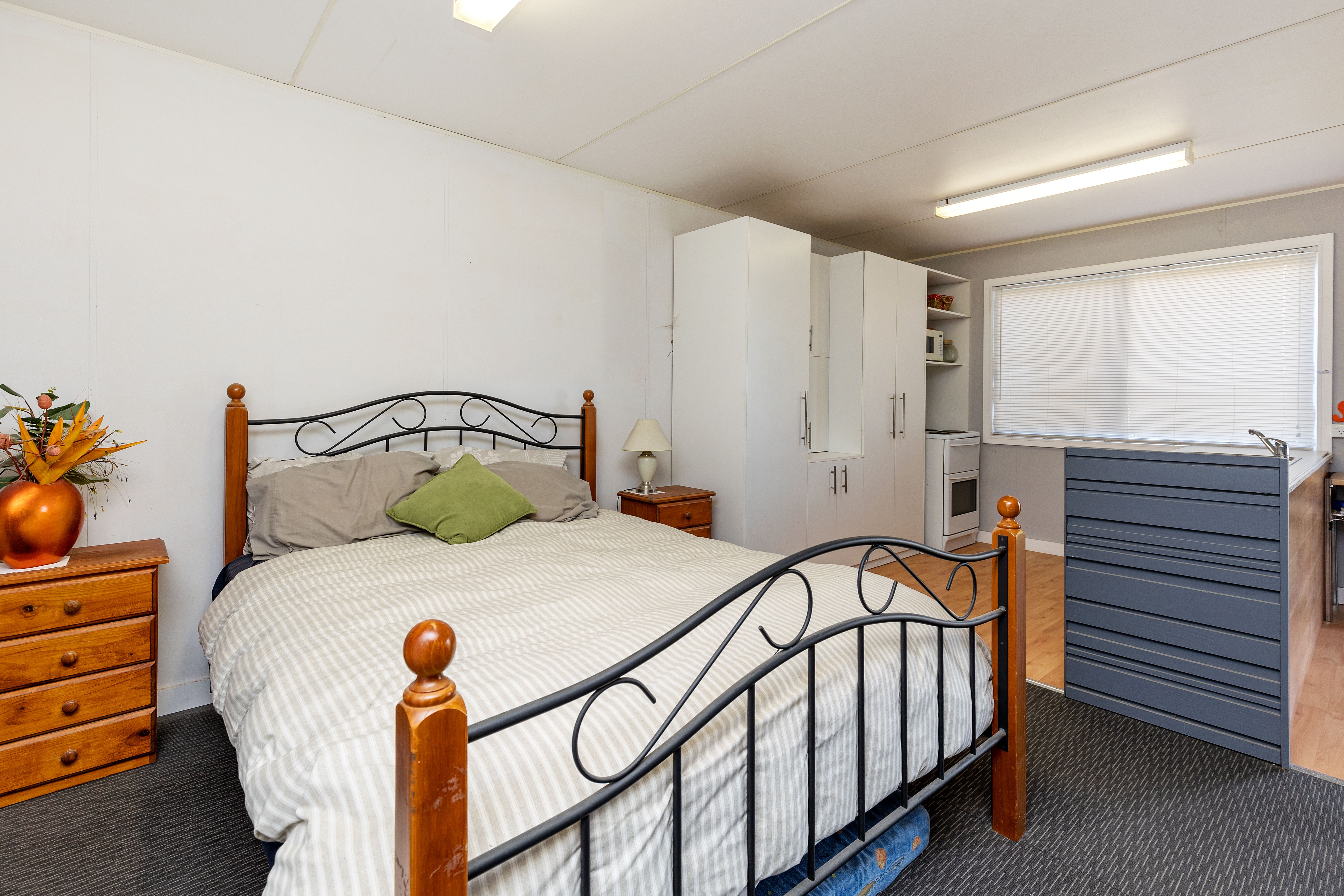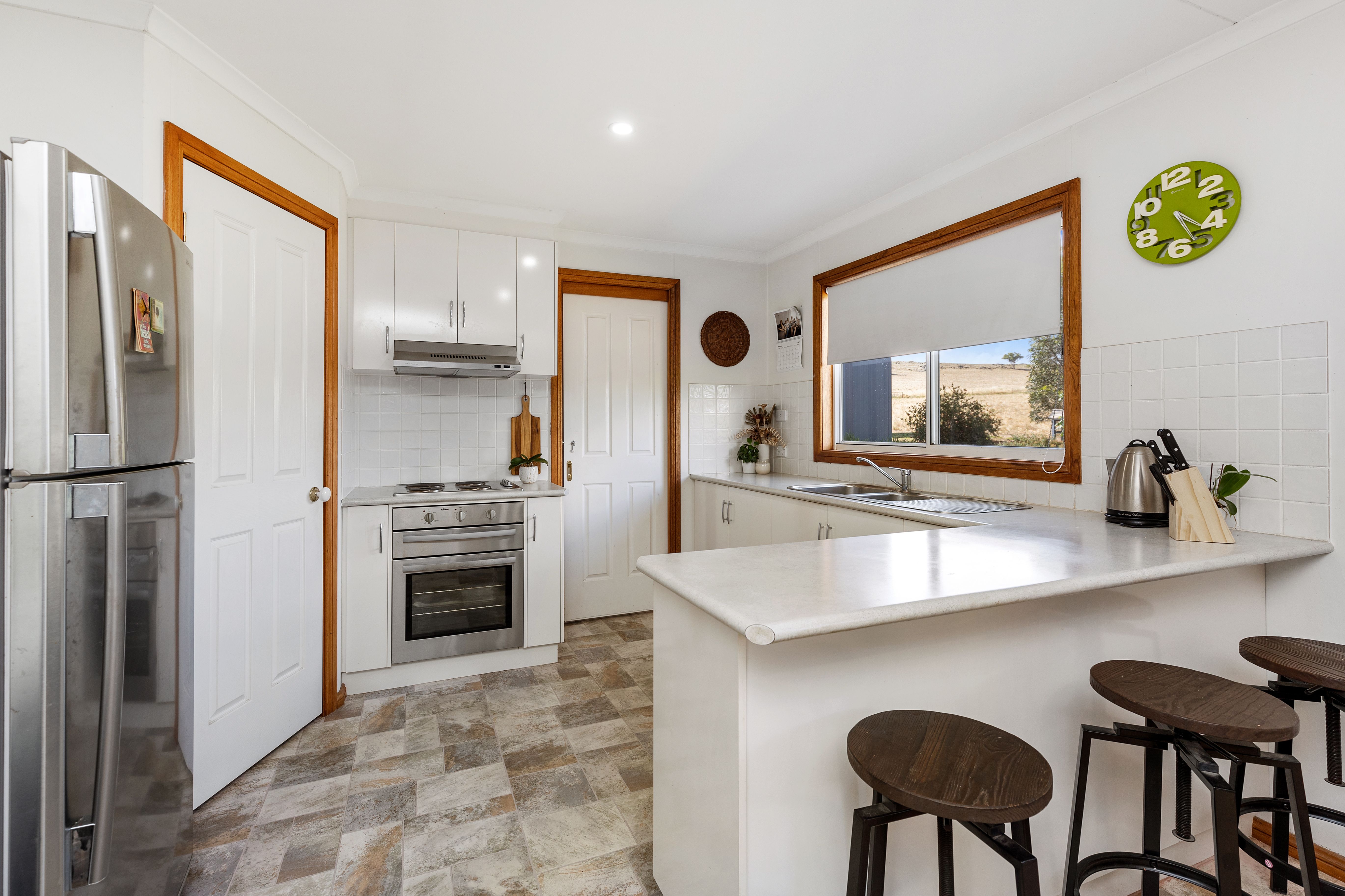 Kitchen in the main house is practical with a simple design and electric cooking. Enjoy reverse cycle heating and cooling, wood fire and ducted cooling; year-round comfort assured