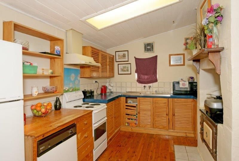 An original kitchen featuring storage plus, the old wood stove opening to a meals and sun-room area