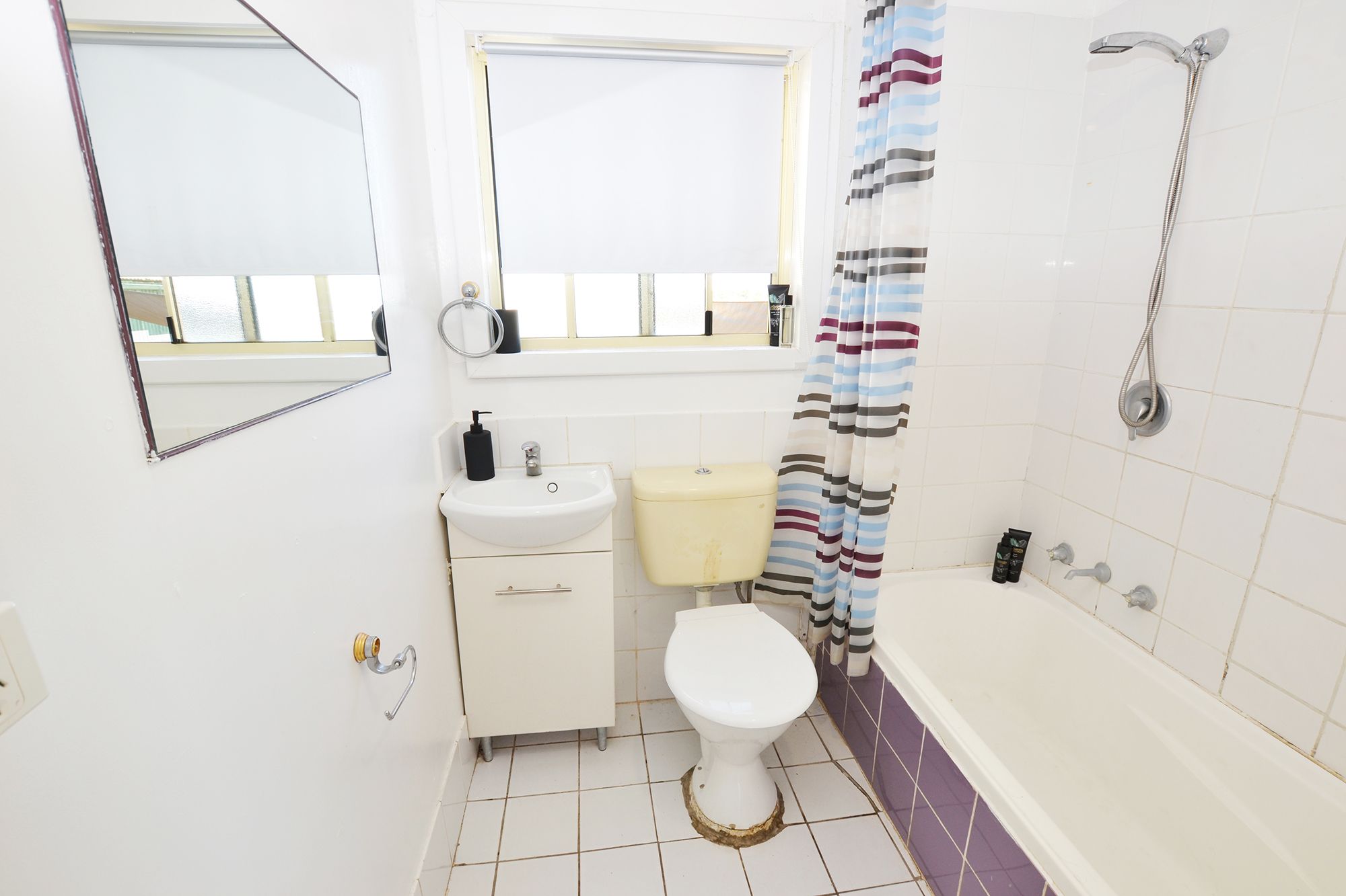Bathroom is original but presents well with a modern vanity and the shower over the bath