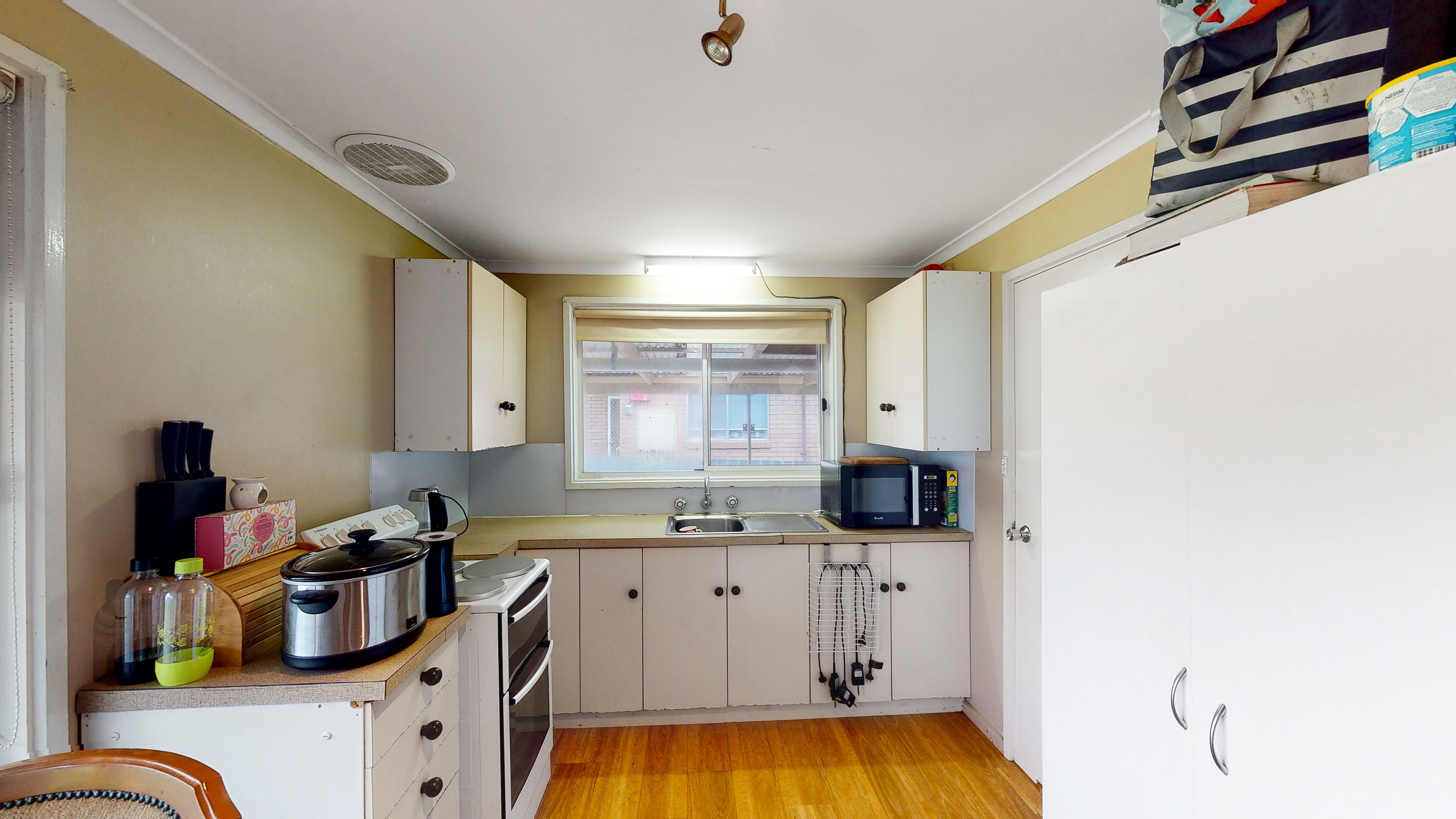 Very tidy kitchen with electric cooking, ample cabinetry and access to the outdoor zone.