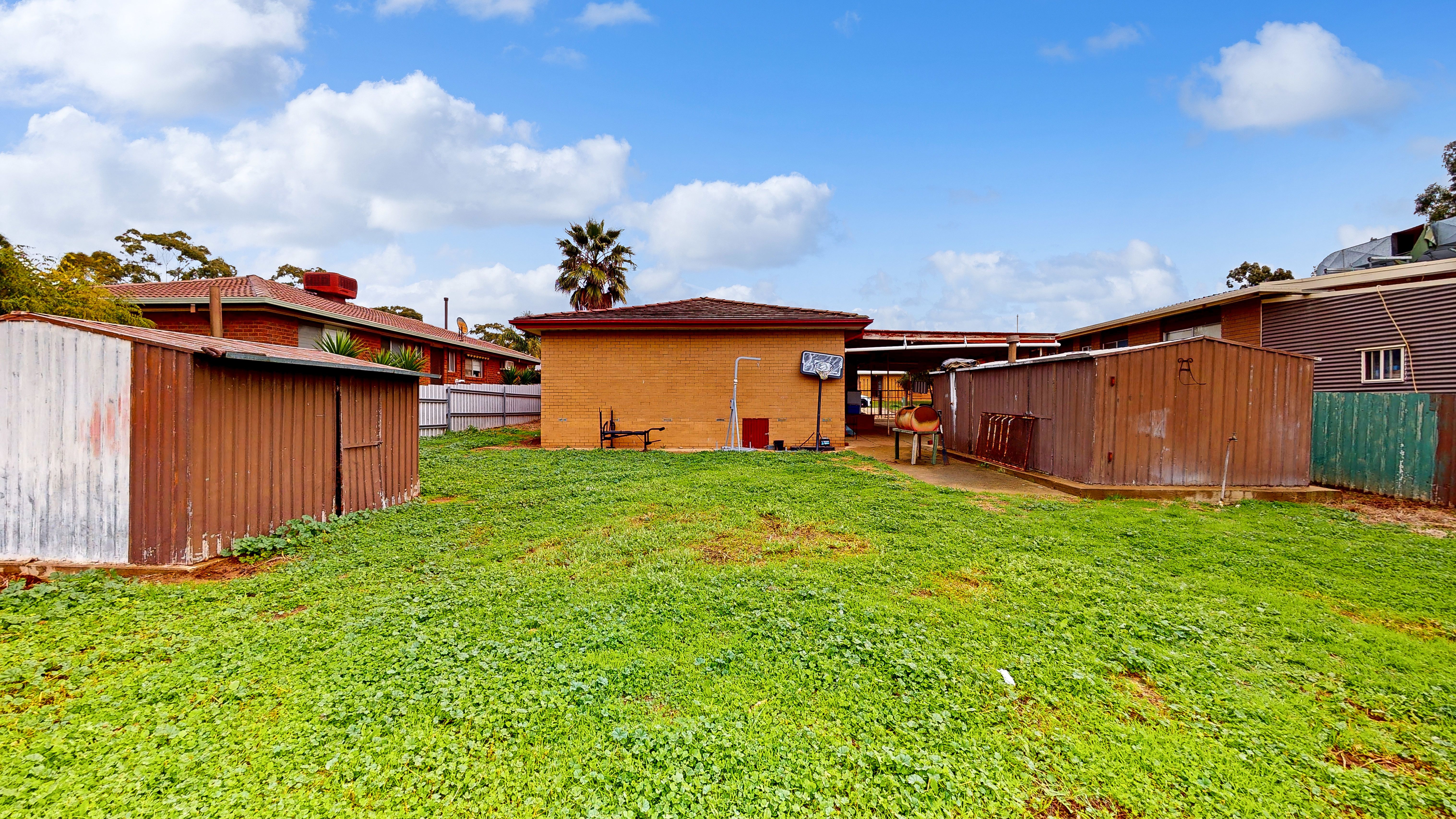 Fabulous outdoor entertaining area with 2 large garden sheds and a single carport with drive through access.