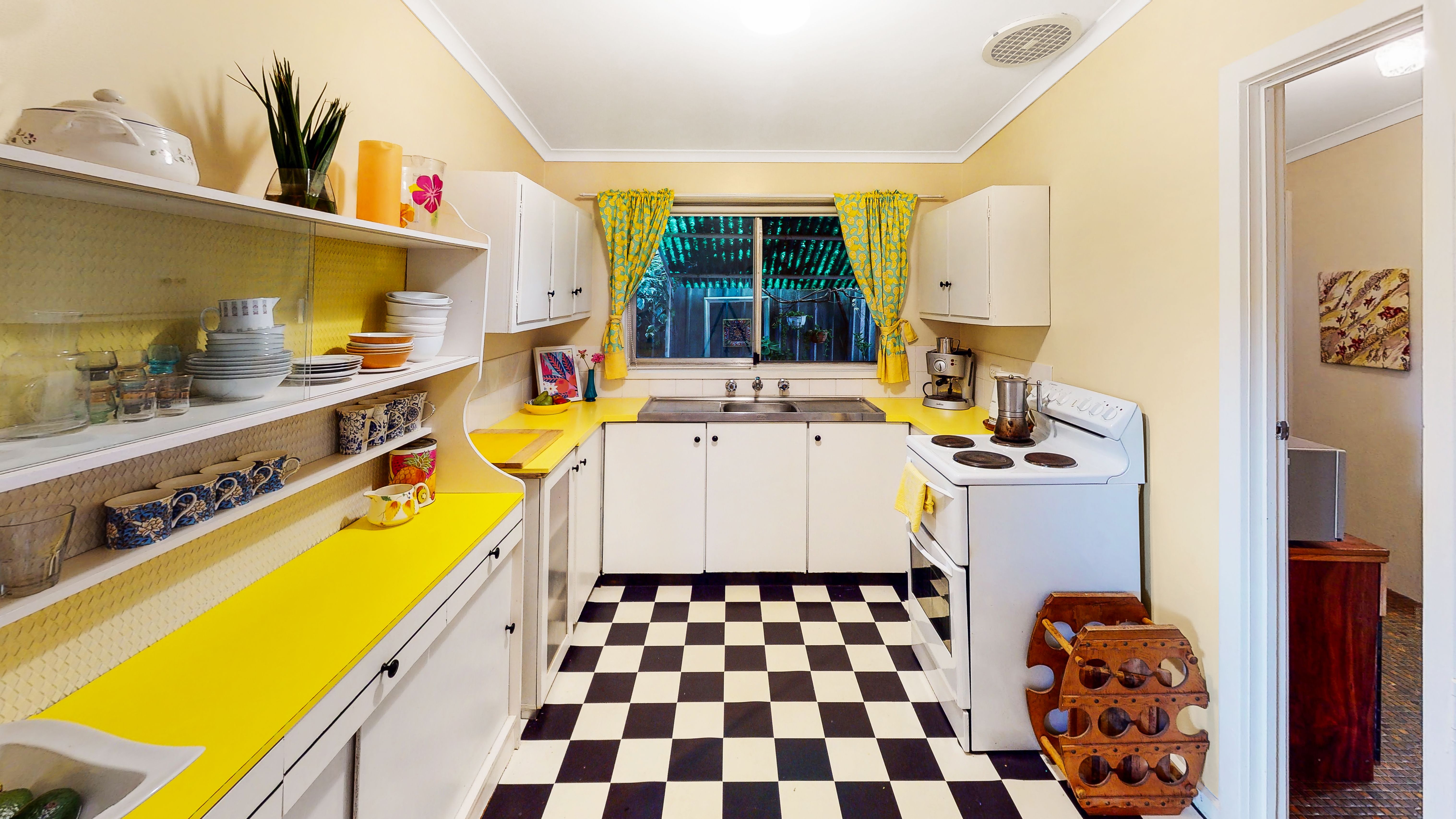 Kitchen is inviting with simple cabinetry and preparation space. With an electric cooktop plus a freestanding cabinet to work as an extension of storage, this compact yet practical space will entice.