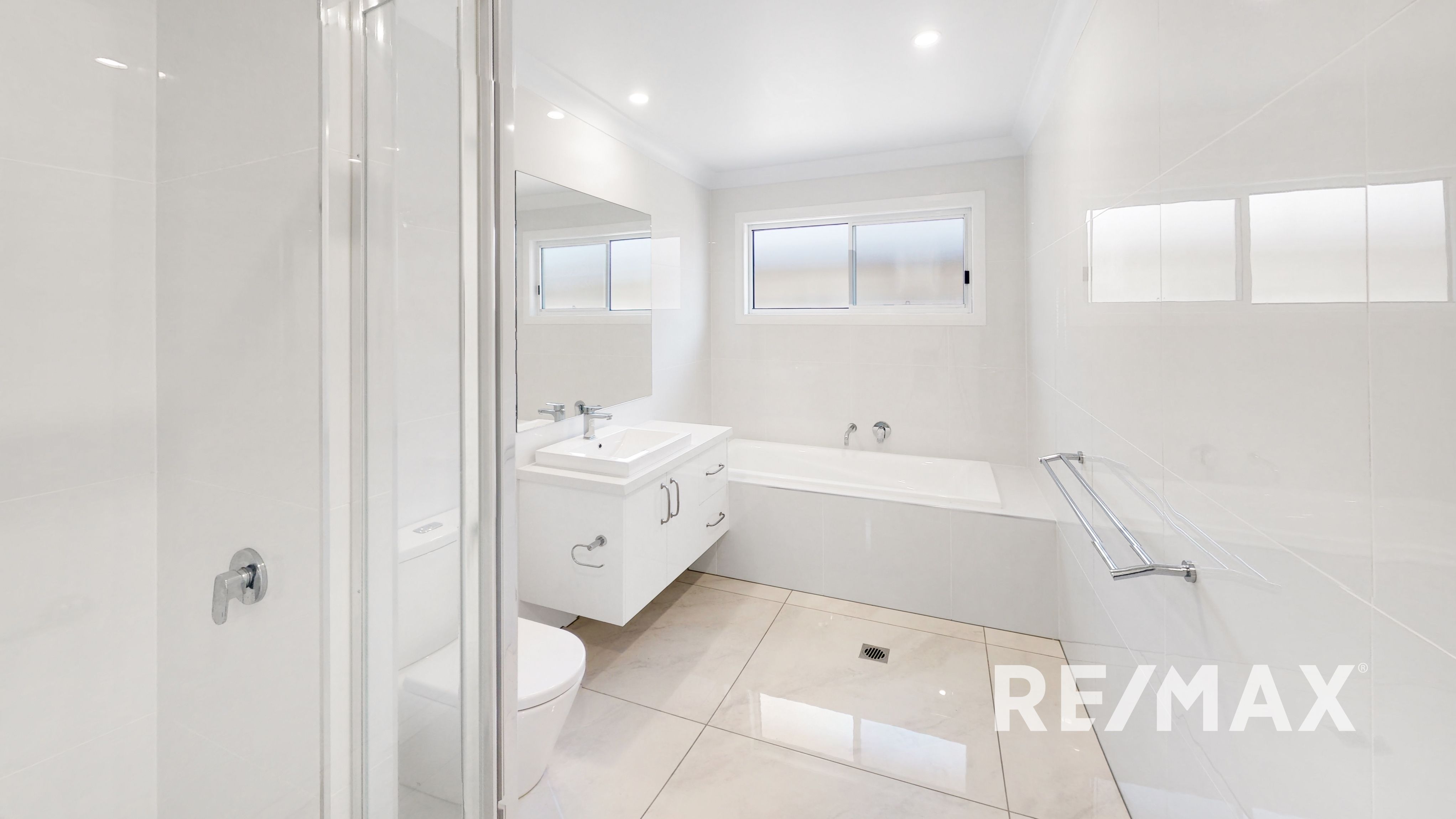 Well appointed main bathroom with floor to ceiling tiles, floating vanity with stone benchtop and so much size for enjoyment