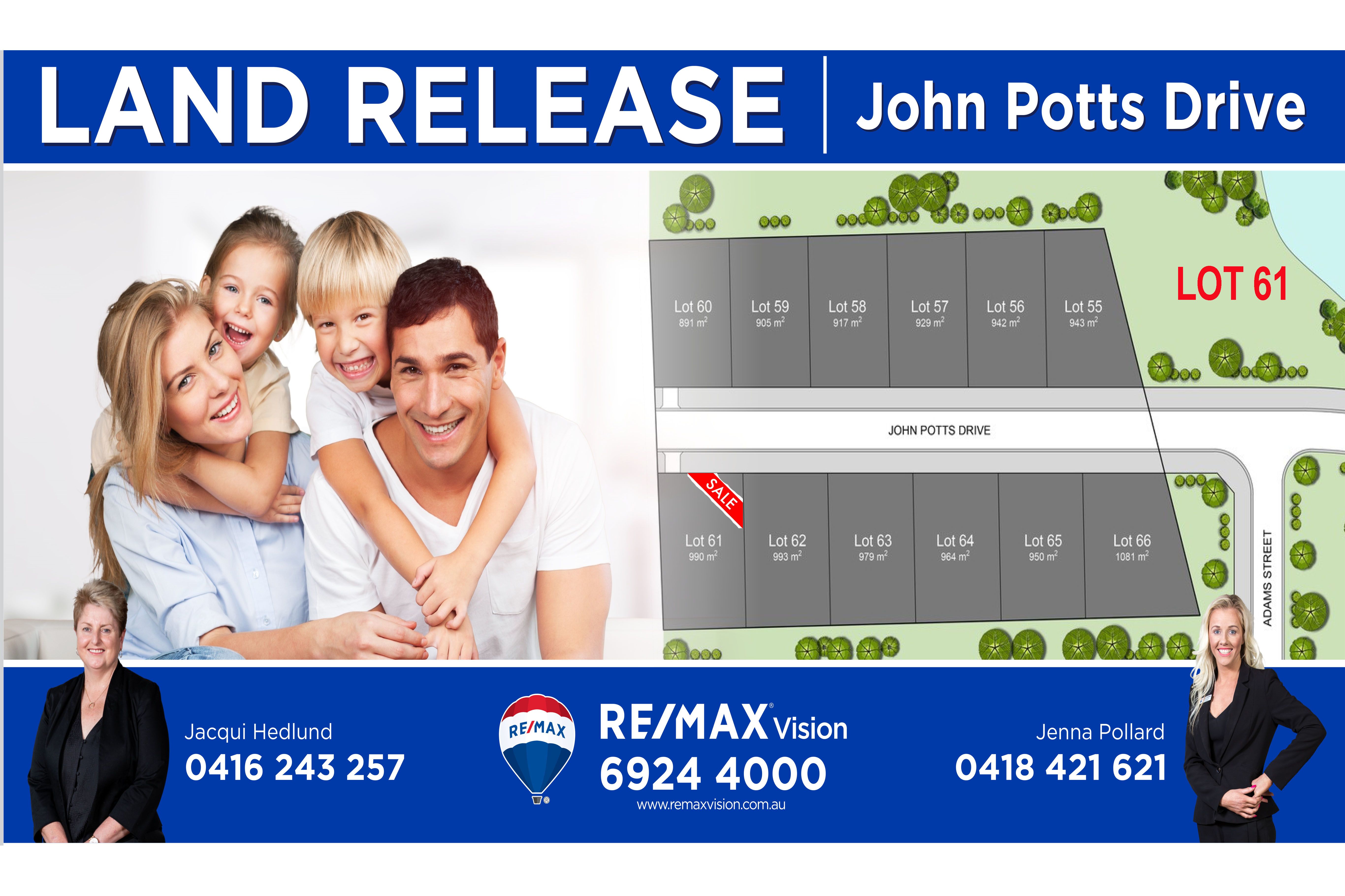 Lot 61 John Potts Dr Junee is a generous 990m2 in size with a width of 25m wide and 39m in depthThis exciting extension to the already popular John Potts Dr Junee area is a fabulous opportunity to secure a flat and generous sized block all serviced ready to go...
